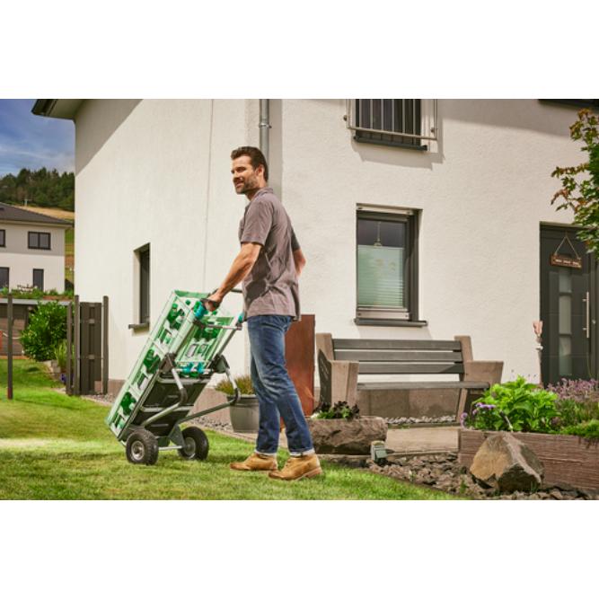 | Función como carretilla para sacos (150 kg de capacidad de carga): Pared trasera para apoyar objetos voluminosos Transporte seguro de objetos voluminosos, planos e incluso redondos gracias a la forma especial de la pared trasera Amplia superficie de apoyo con puente continuo para un transporte seguro, p. ej. de eurocajas (hasta un máx. de 400 x 600 mm) Apta para escaleras (máx. 100 kg) gracias a su diseño robusto y a sus grandes ruedas neumáticas Articulación giratoria en el armazón de acero para la conversión rápida con encaje adicional para un manejo cómodo en escaleras |