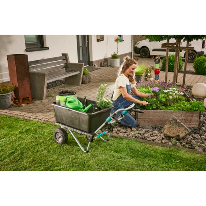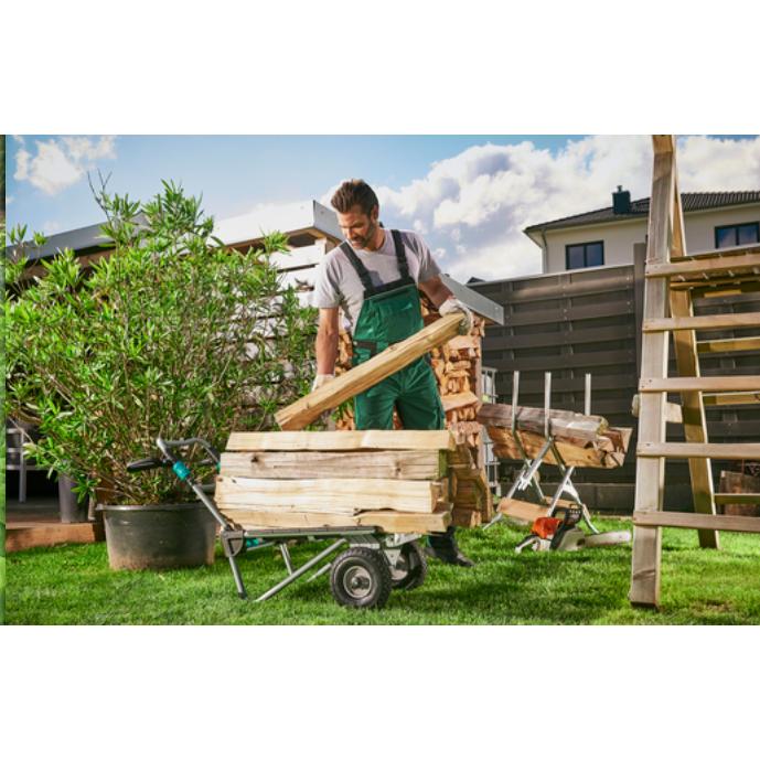 | Función como carretilla de jardín (200 kg de capacidad de carga): Amplia superficie de apoyo con puente continuo para un transporte seguro, p. ej. de eurocajas (hasta un máx. de 400 x 600 mm) Estática de 2 ruedas para una carga y un transporte a prueba de vuelco Superficie de carga baja para facilitar la carga Flexibilidad gracias a la pala plegable: replegada para el transporte de objetos alargados, desplegada para la estabilización de cargas |