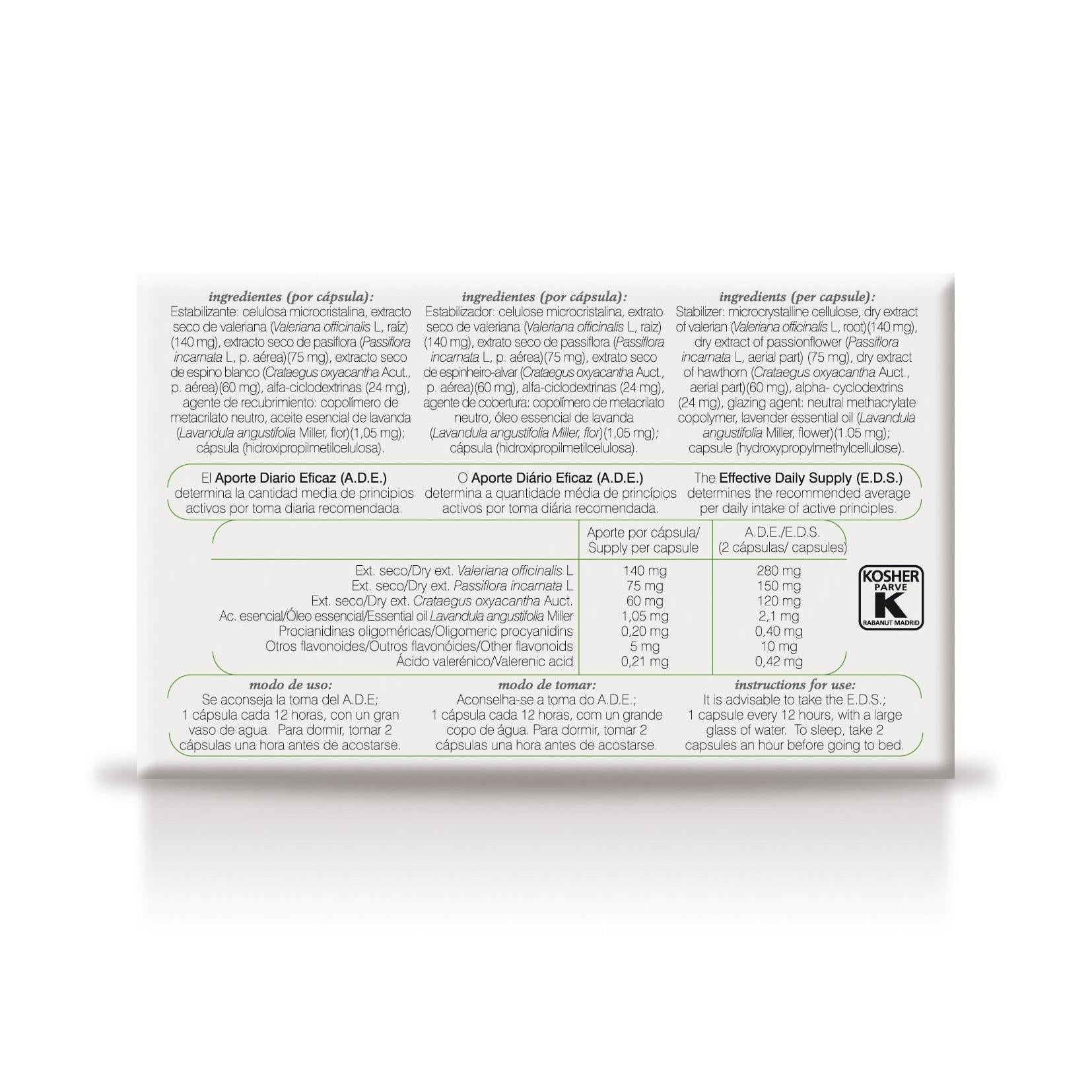 (por cápsula) Estabilizante: celulosa microcristalina, extracto seco de valeriana (Valeriana officinalis L, raíz)(140 mg), extracto seco de pasiflora (Passiflora incarnata L, P. aérea)(75 mg), extracto seco de espino blanco (Crataegus oxyacantha Acut, P. aérea)(60 mg), alfa-ciclodextrinas (24 mg), agente de recubrimiento: copolímero de metacrilato neutro, aceite esencial de lavanda (Lavandula angustifolia Miller, flor)(1,05 mg), cápsula (hidroxipropilmetilcelulosa).