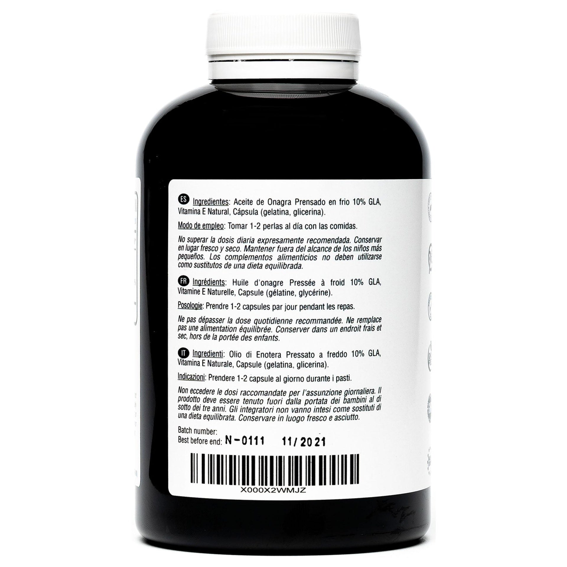 Aceite de Onagra Prensado en frio 10% GLA, Vitamina E Natural, Cápsula (gelatina, glicerina).