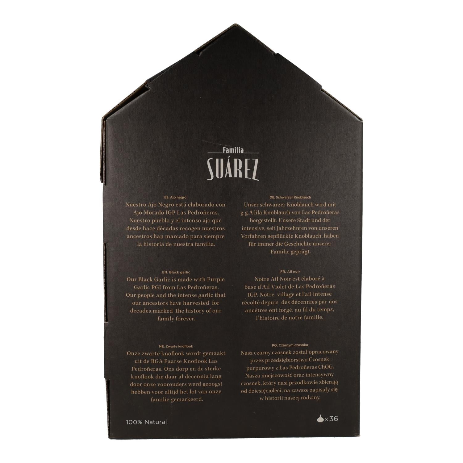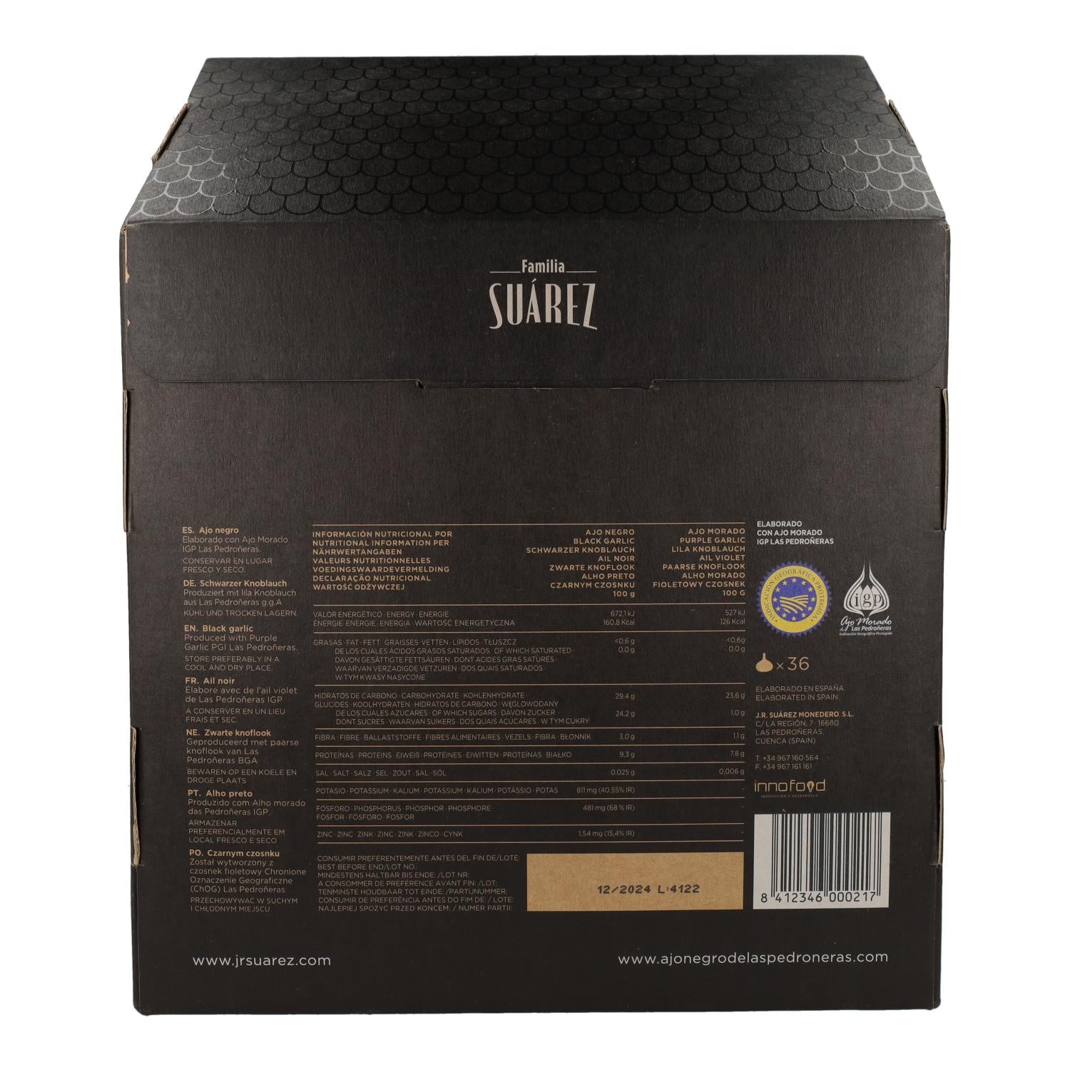 - Presentado en una bolsa de 1 kg, que contiene dos bolsas de medio kilo cada una. Cada una de estas bolsas de medio kilo está compuesta por varios envases individuales, cada uno de los cuales contiene dos cabezas de ajo negro.