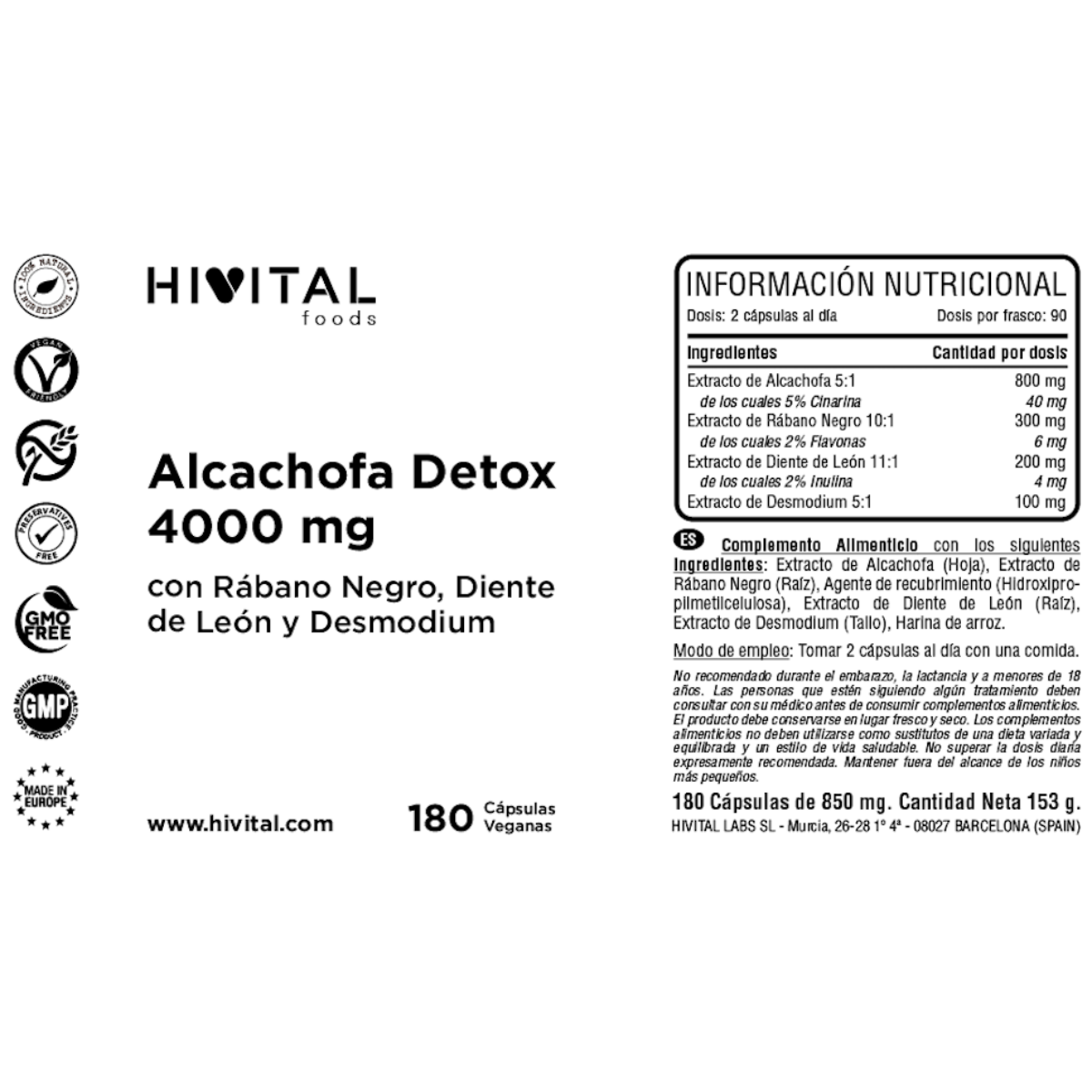 Toda la información sobre "Alcachofa Detox 4000 mg Hivital 180 cápsulas veganas"