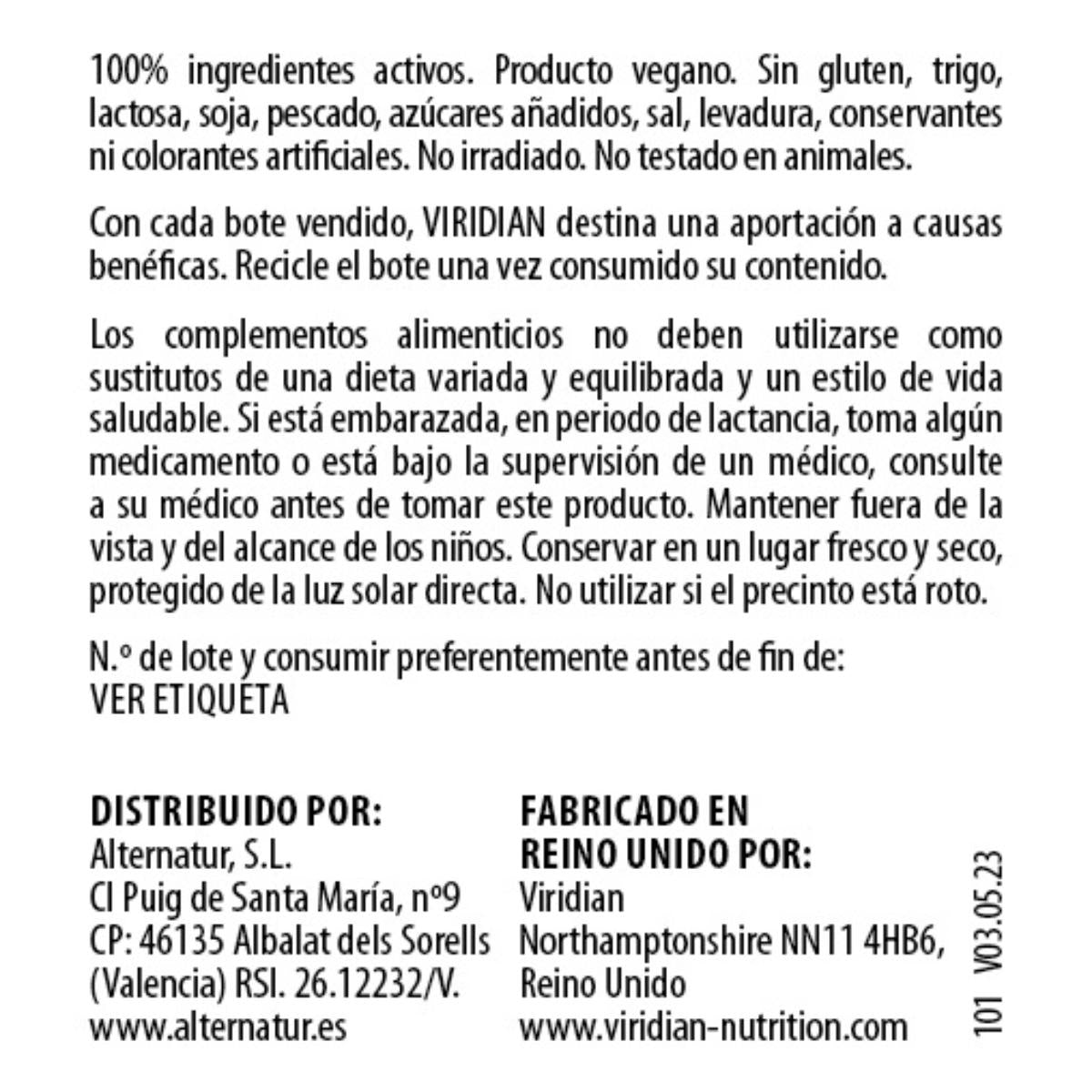 100% ingredientes activos. Apto para veganos. Kosher. Sin gluten, trigo, lactosa, soja, pescado, azúcares añadidos, sal, levadura, conservantes ni colorantes artificiales. No irradiado. No testado en animales.