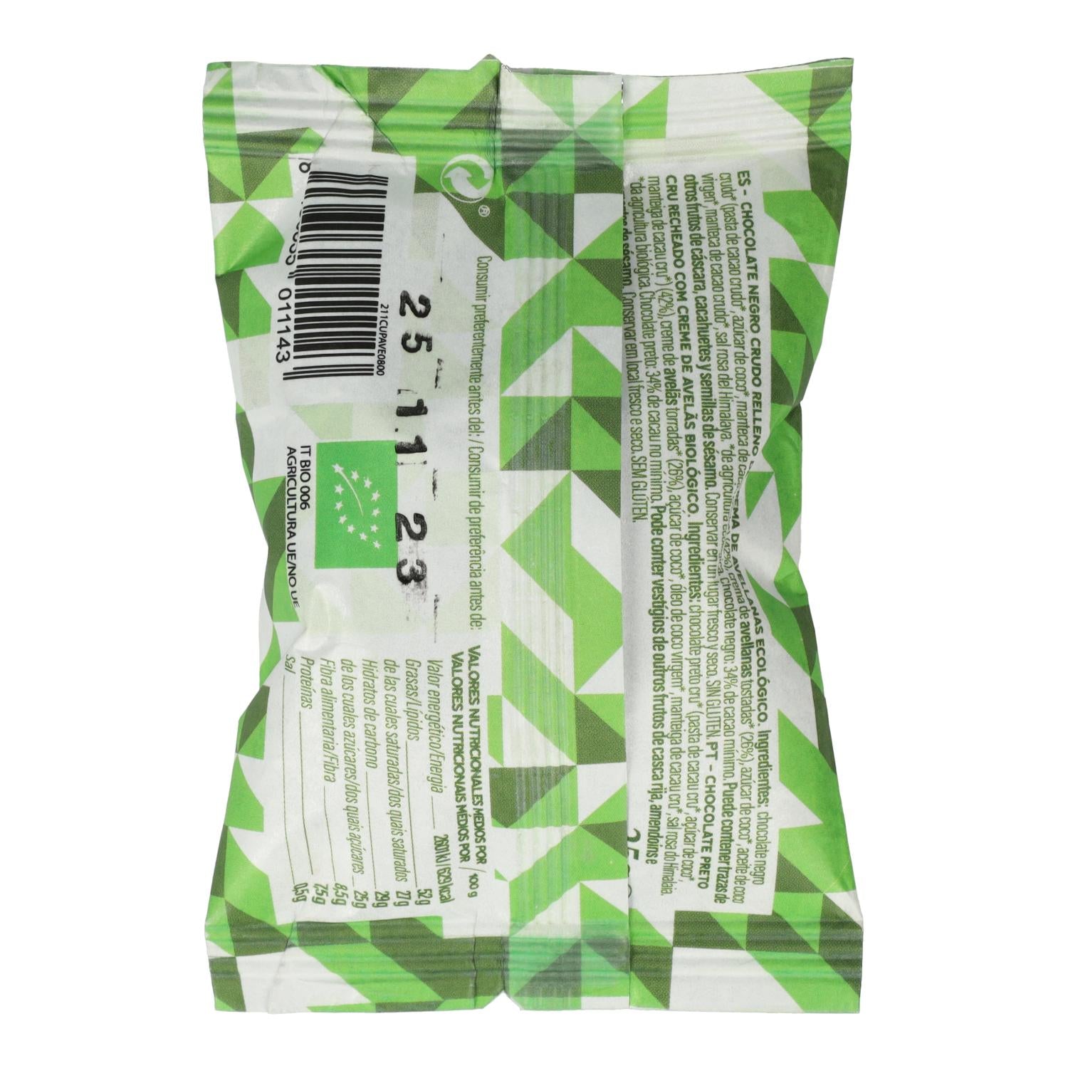 Elaborada con cobertura de chocolate negro crudo y manteca de cacao y rellena de crema de avellanas 100%.