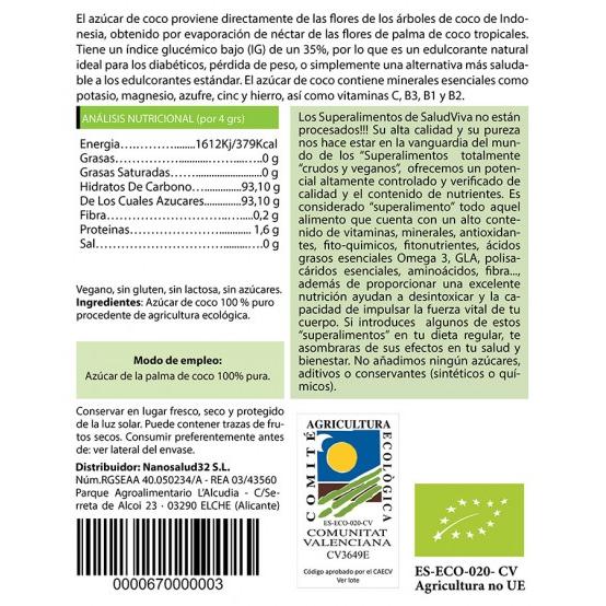 Ingredientes: azúcar de coco 100% puro procedente de agricultura ecológica.