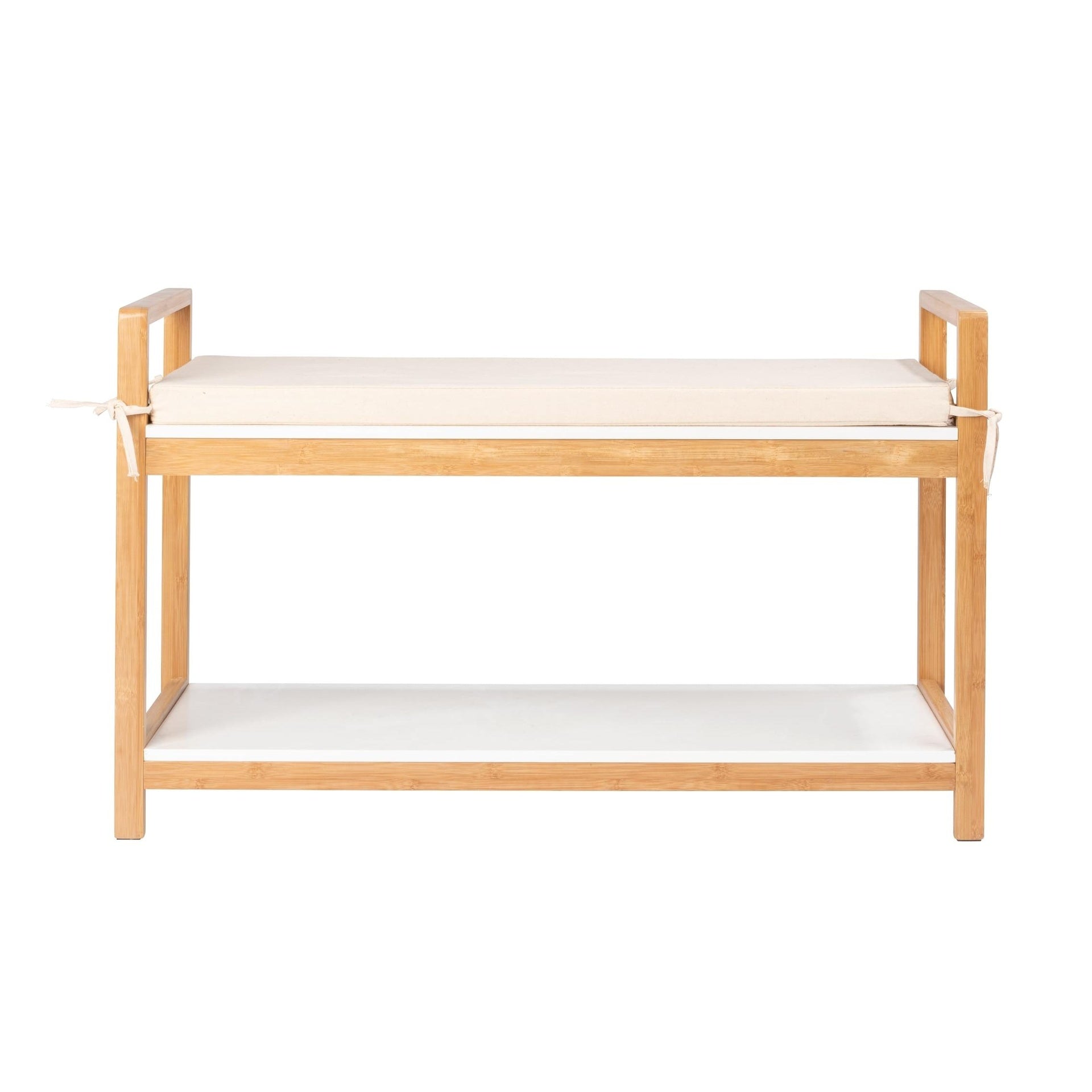 Zapatero fabricado en bambú con asiento acolchado en la parte superior.