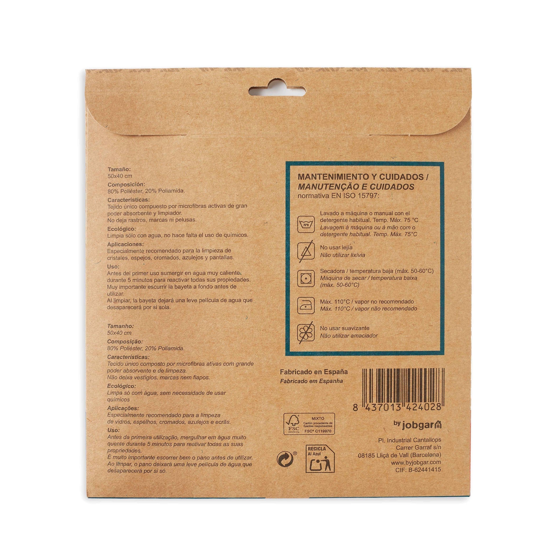 - Ecolimpia está fabricada en España, al ser un producto de proximidad logramos un bajo impacto ambiental en emisiones de CO2 y reducimos el gasto energético que produce el transporte de productos. El Packaging consta del certificado FSC. Con ello garantizamos la gestión responsable de los bosques y sus recursos. La bayeta limpia solo con agua, sin químicos, de esta manera evitamos contaminar las aguas residuales y el aire, consiguiendo un impacto medioambiental casi nulo.