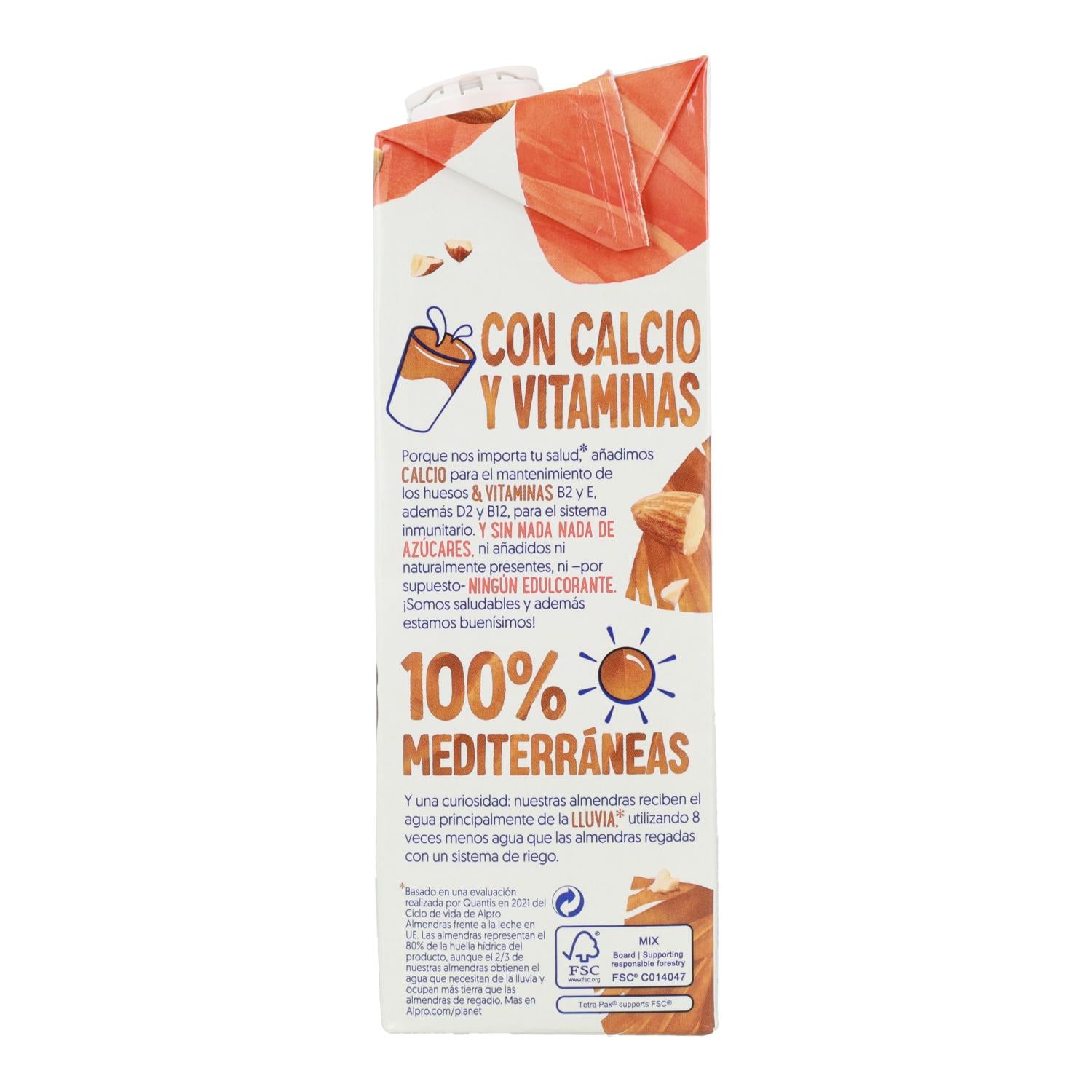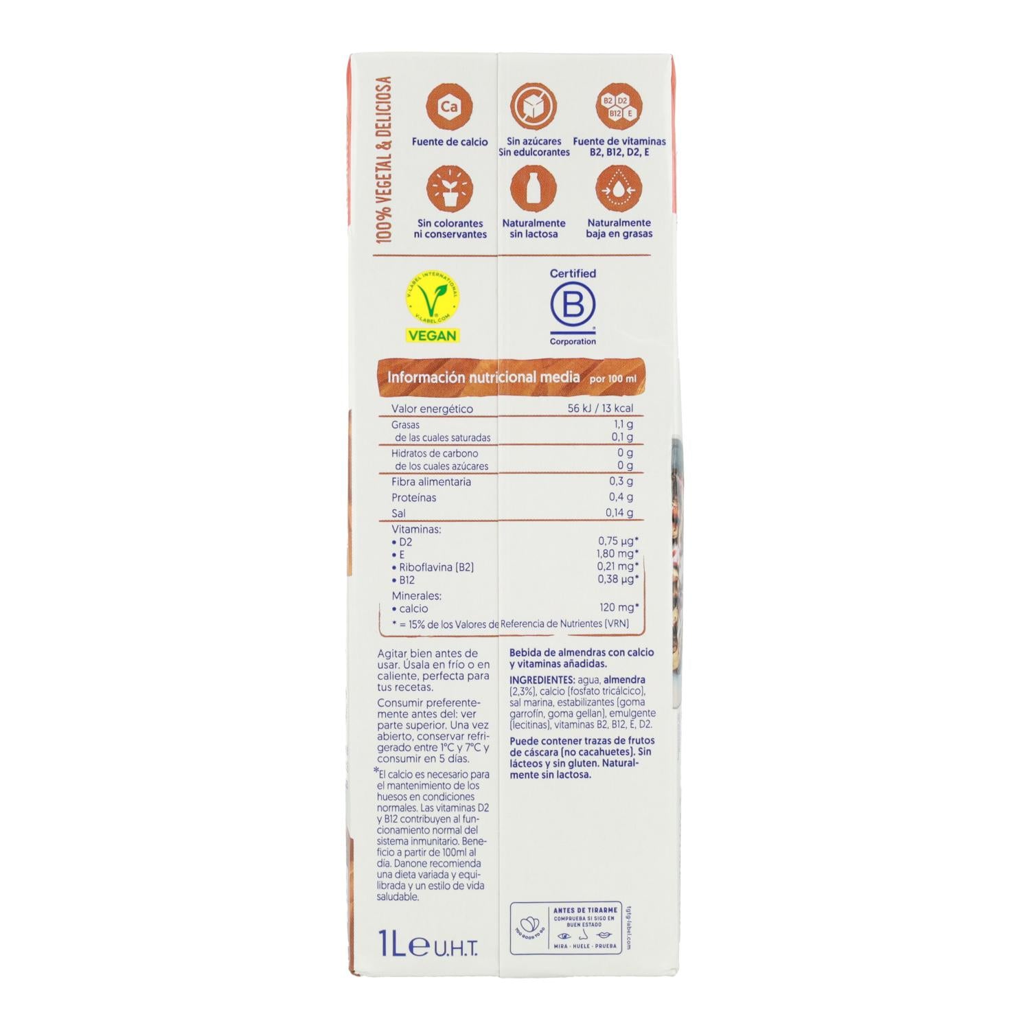 Ingredientes: agua, almendra (2,3%), fosfato tricálcico, sal marina, estabilizantes (goma garrofín, goma gellan), emulgente (lecitinas (girasol)), vitaminas (B2, B12, E, D2)