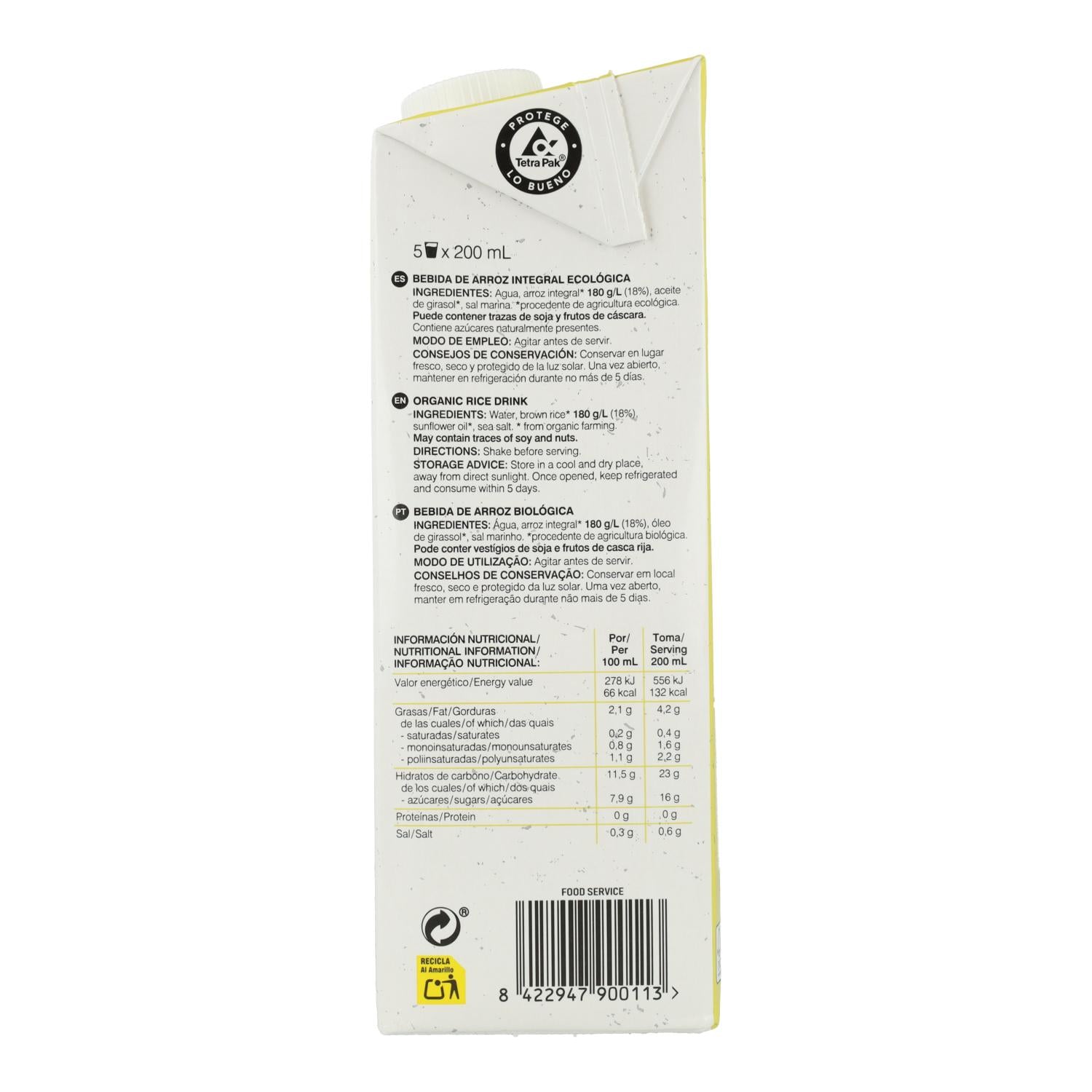 Agua, arroz* integral 180 g/L (18%), aceite de girasol*, sal marina. *Procedente de Agricultura Ecológica.