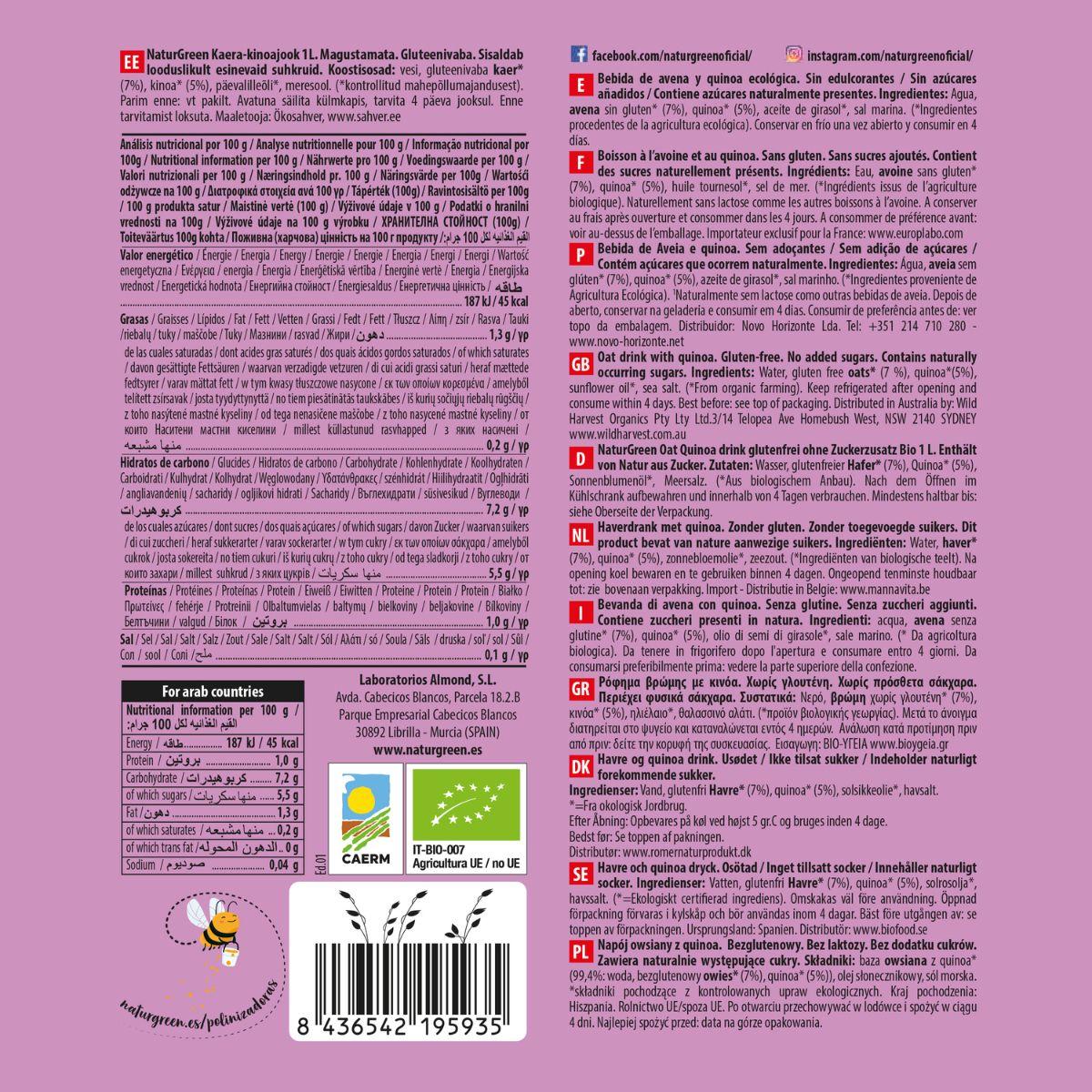 Toda la información sobre "Bebida de Avena y Quinoa Bio Sin Gluten NaturGreen 1 L"