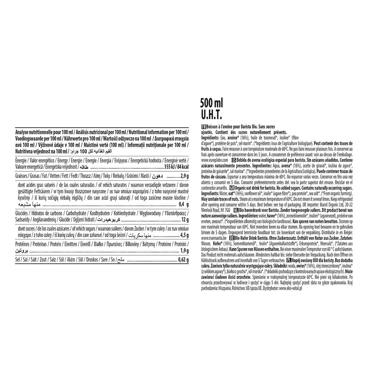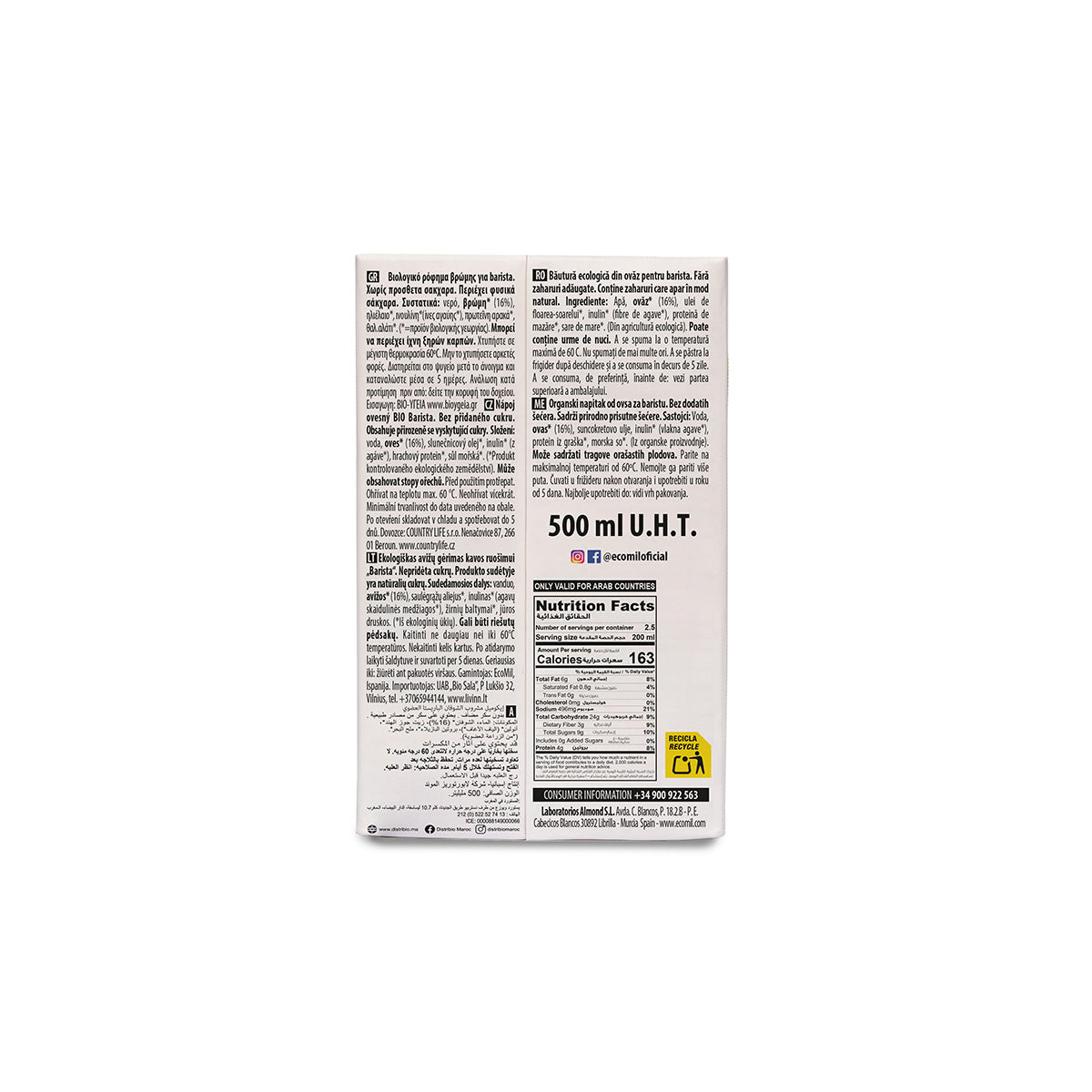 Toda la información sobre "Bebida Vegetal de Avena Barista Sin Azúcar Bio ECOMIL 500 ml"