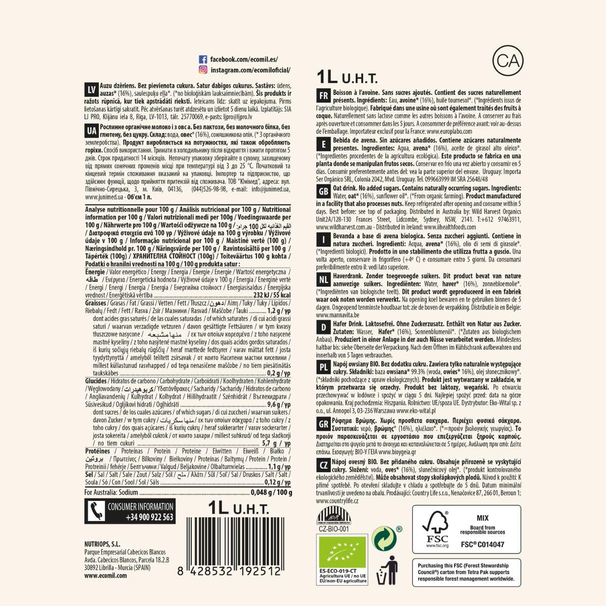 Toda la información sobre "Bebida Vegetal de Avena Bio Sin azúcares añadidos Ecomil 1 L"