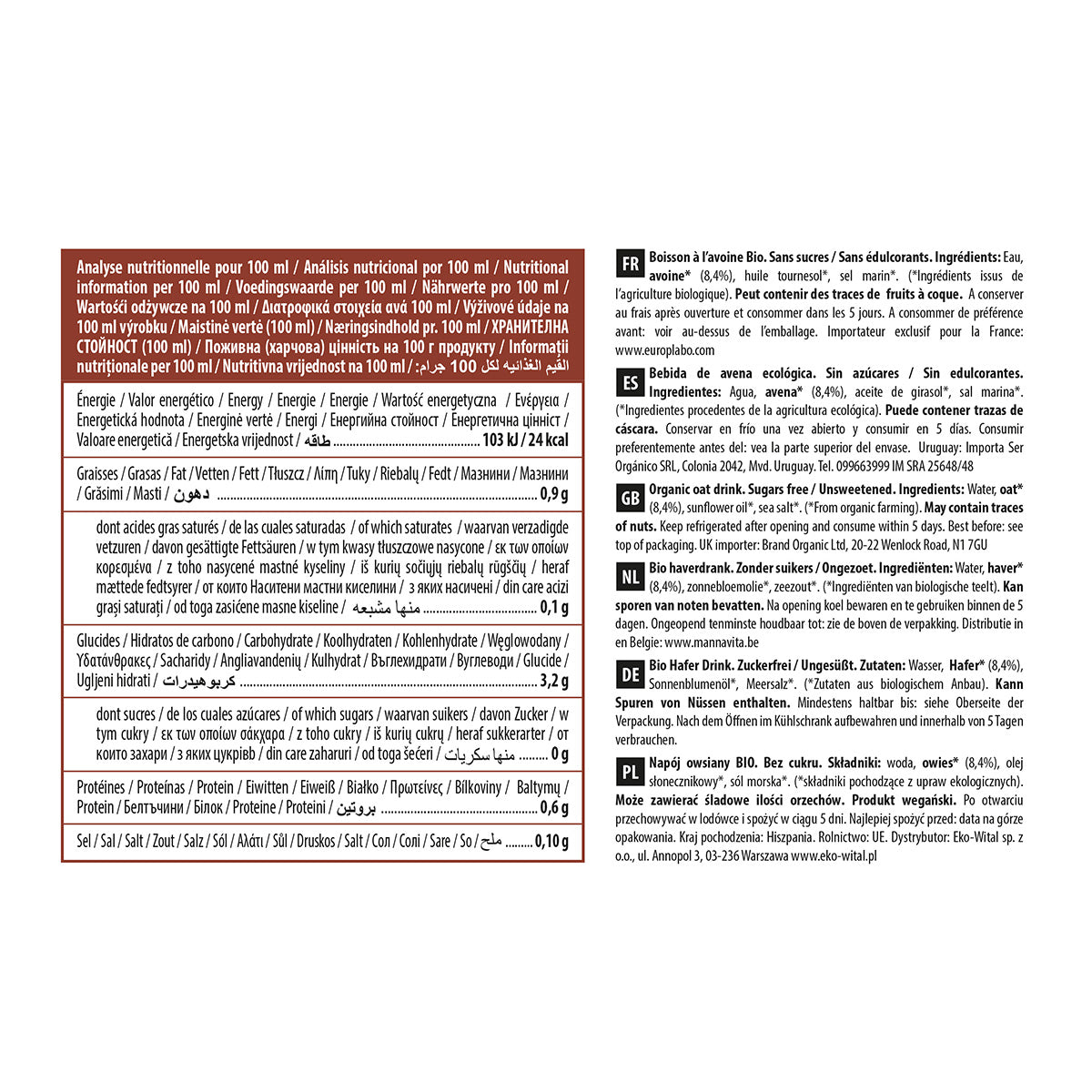 Toda la información sobre "Bebida Vegetal de Avena Sin Azúcar Bio ECOMIL 1 L"