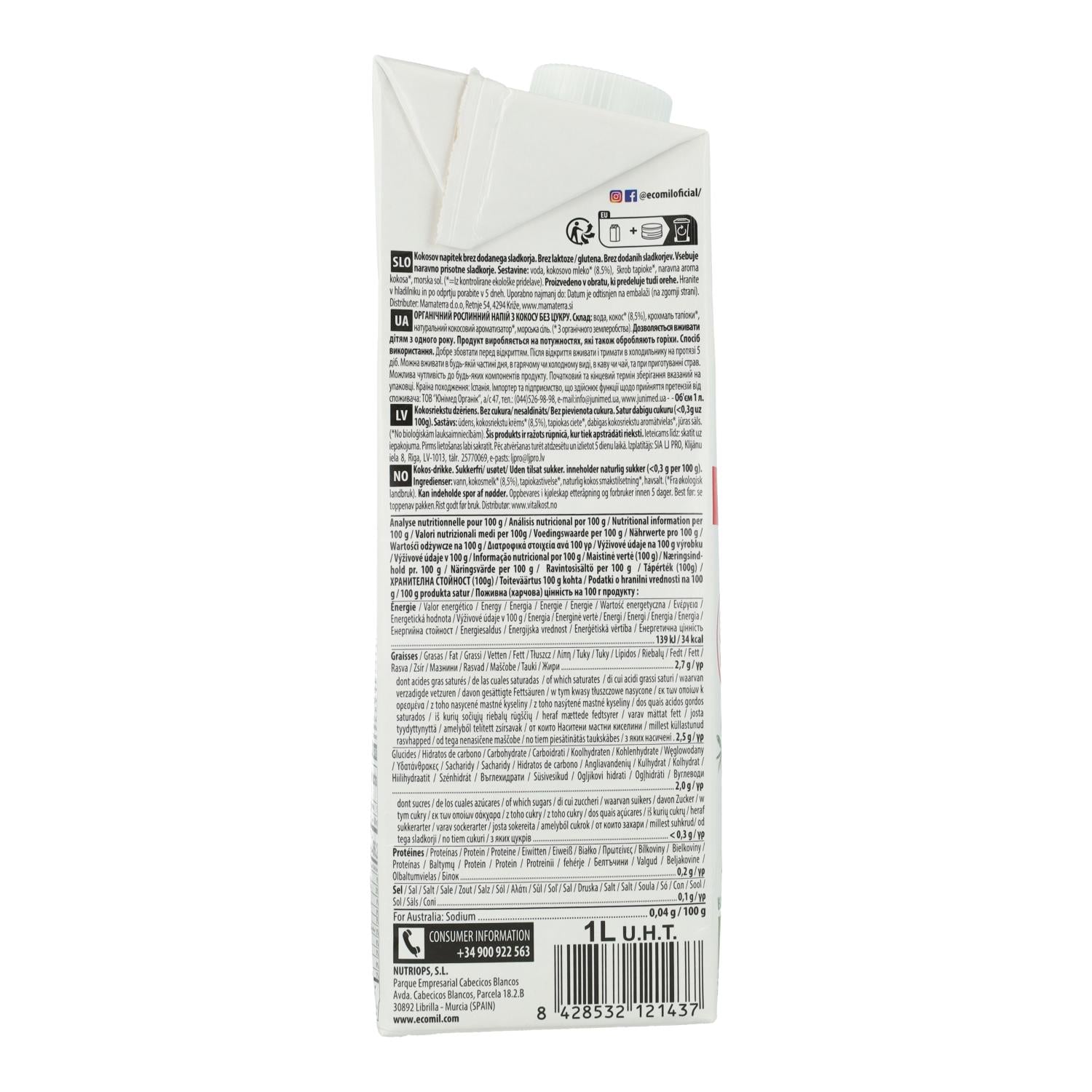 Toda la información sobre "Bebida vegetal de coco sin azúcar, sin gluten y sin lactosa Ecomil 1L"