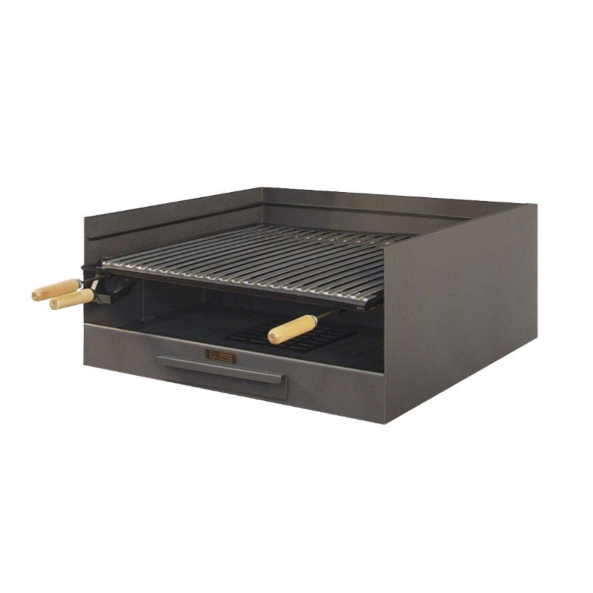- Parrilla tipo argentino en forma de v con puños de madera, canaliza la grasa hasta la parte delantera, para que la grasa no caiga encima del carbón.