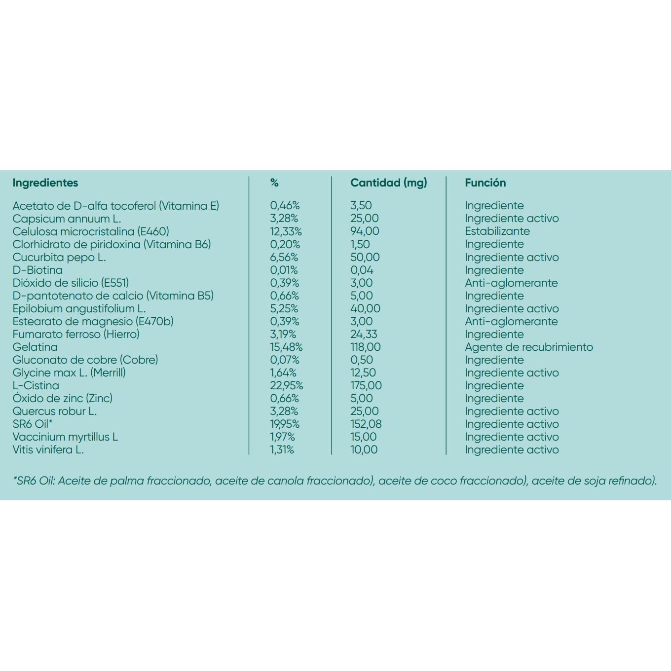 L-Cistina, aceite de semilla de palma fraccionado, estabilizador (celulosa microcristalina), extracto de frutos de Cucurbita pepo L., aceite de canola fraccionado, extracto de partes aéreas de Epilobium angustifolium L., extracto de corteza de Quercus robur, extracto de frutos de Capsicum annuum L., fumarato ferroso, extracto de frutos de Vaccinium myrtillus L, extracto de fruto de Glycine max L. (Merrill), extracto de hoja de Vitis vinífera L., aceite de coco fraccionado, pantotenato de D-calcio (vitamina B5), óxido de zinc, acetato de D-alfa tocoferol (vitamina E), antiaglomerantes (dióxido de silicio -E551- y estearato de magnesio -E470b-), clorhidrato de piridoxina, gluconato de cobre, D-biotina y aceite de soja refinado. Contiene un derivado de la soja.