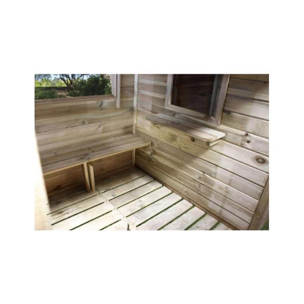 Esta cabaña de madera también está equipada con suelo, techo de fieltro bituminoso, puerta de granja y 4 ventanas. Está destinado a niños de 3 a 12 años .