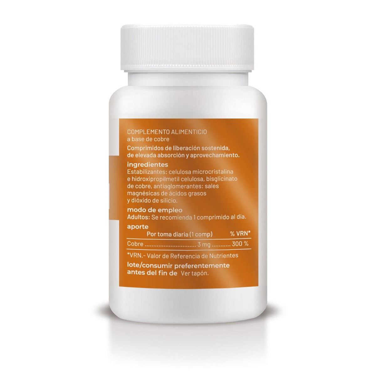 INGREDIENTES: Estabilizantes: celulosa microcristalina e hidroxipropilmetil celulosa, bisglicinato de cobre, antiaglomerantes: sales magnésicas de ácidos grasos y dióxido de silicio.