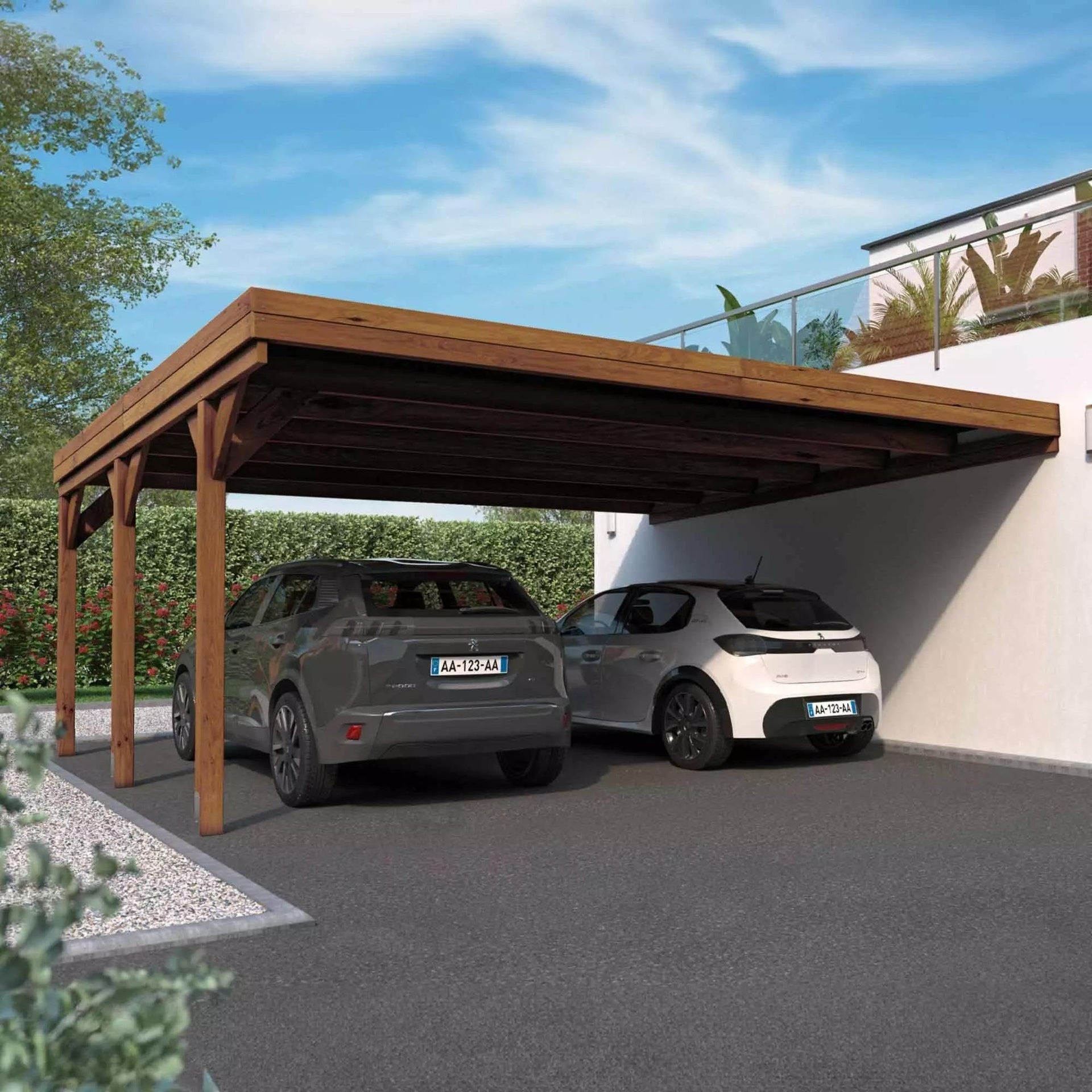 Una marquesina doble adosada en madera certificada y muy resistente.
