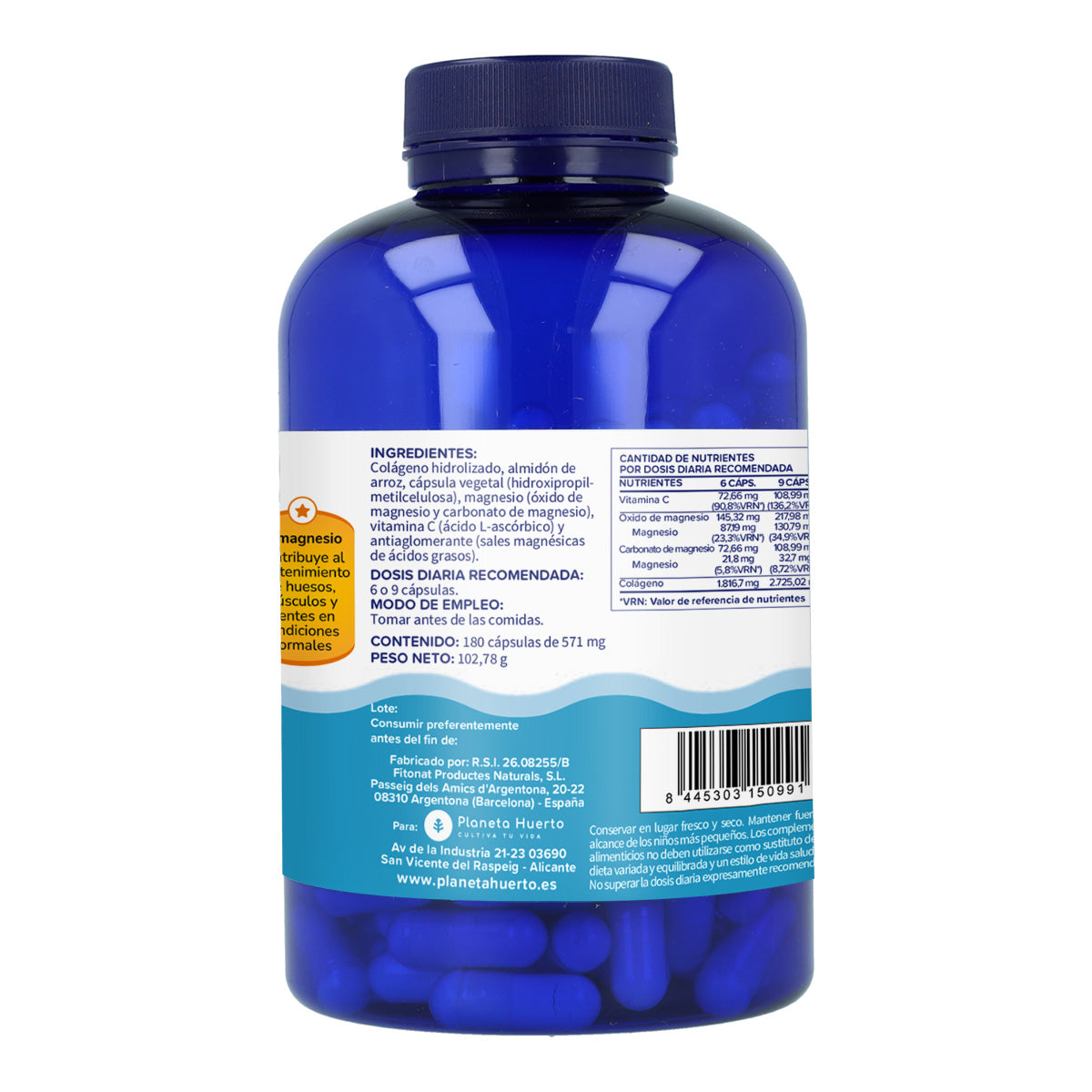 Por 3 cápsulas: Colágeno 908,34 mg, carbonato de magnesio 36,33 mg, óxido de magnesio 72.66 mg, vitamina C 36.55 mg, estearato de magnesio.
