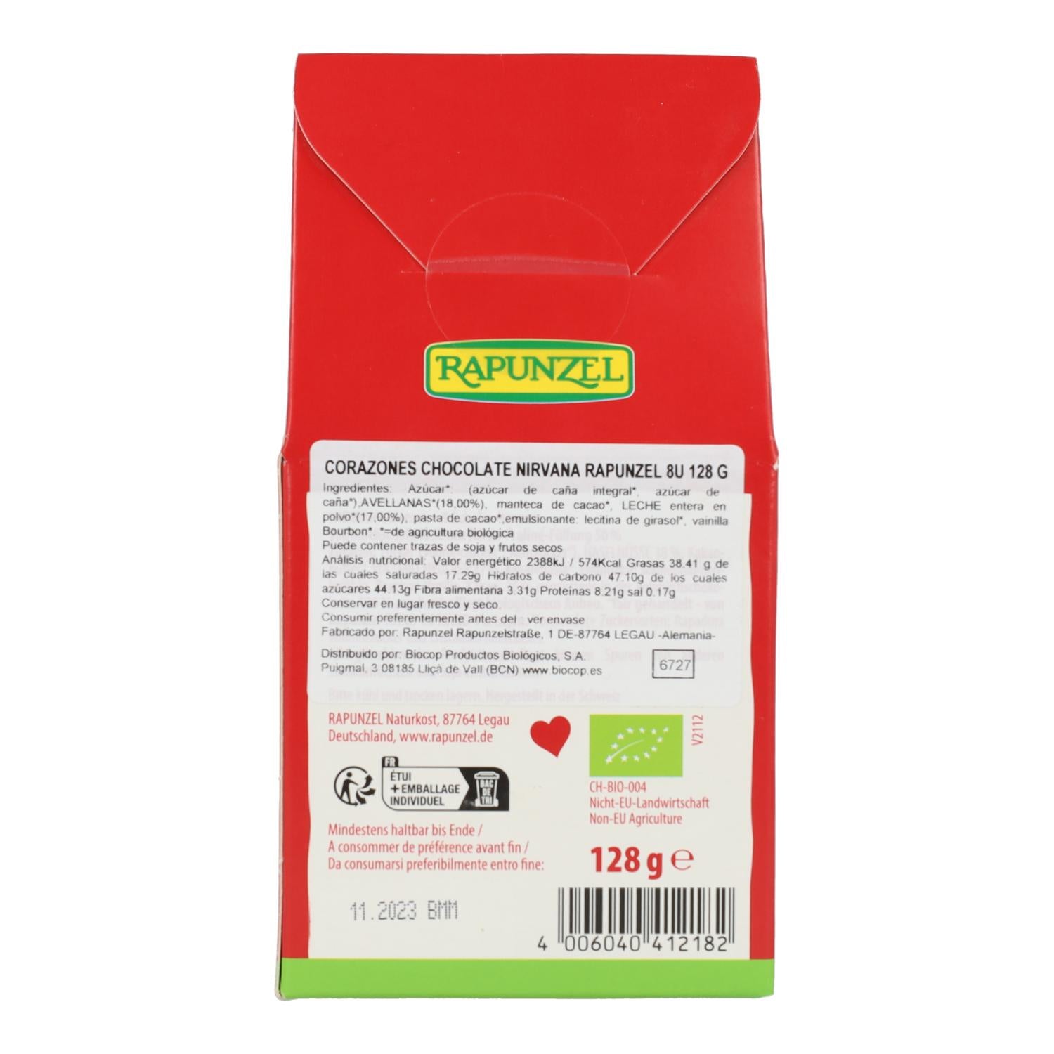 Toda la información sobre "Corazones de Chocolate Nirvana BIO Rapunzel 8 uds de 16 gr"
