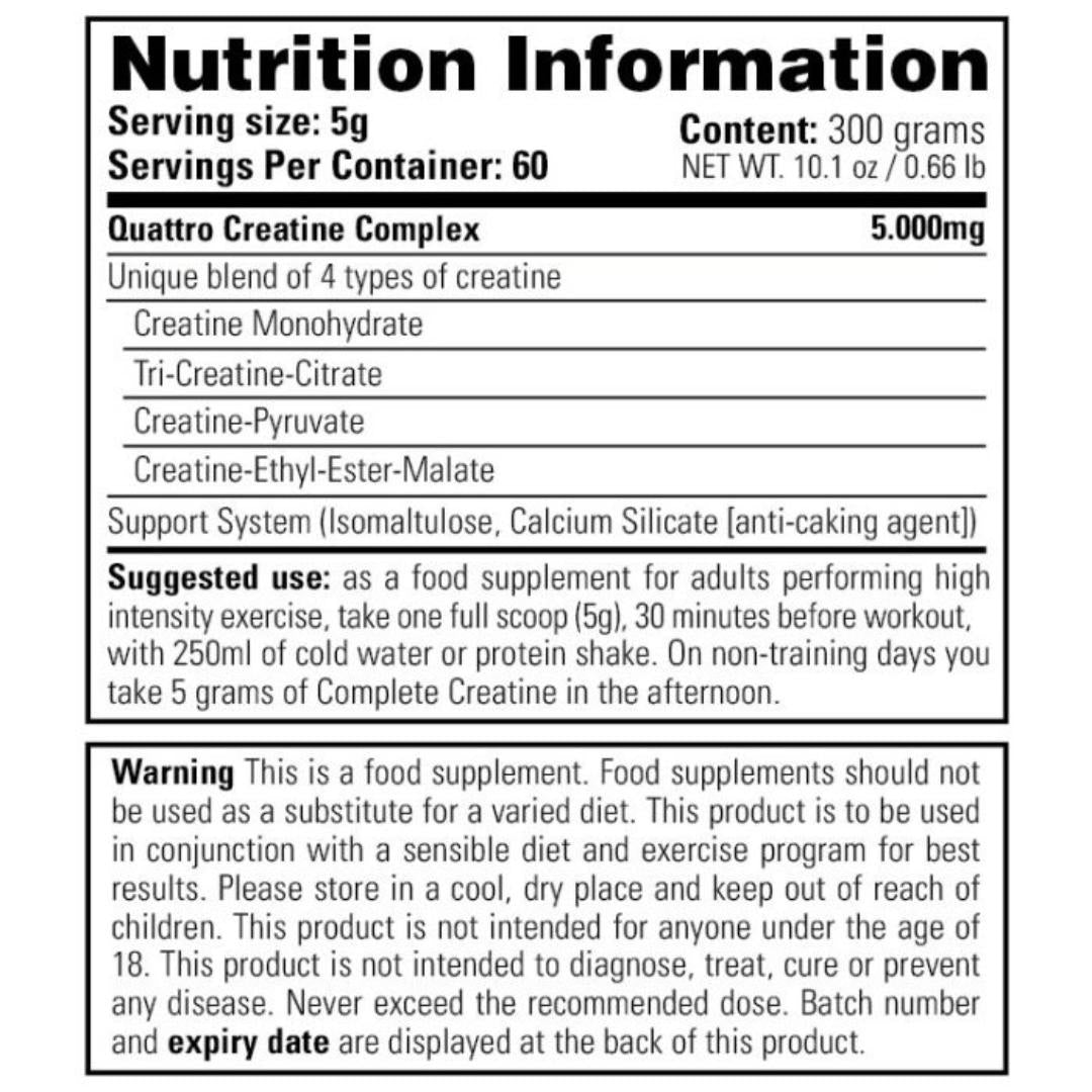 *IR% Complejo de creatina 5g Creatina monohidrato Citrato de tri-creatina Piruvato de creatina Malato de creatina etil éster Ingredientes: Complejo de creatina: (Creatina monohidrato, Citrato de tri-creatina, Piruvato de creatina, Malato de creatina etil éster), Isomaltulosa* (edulcorante), silicato cálcico (antiaglomerante). *La isomaltulosa es una fuente de glucosa y fructosa.