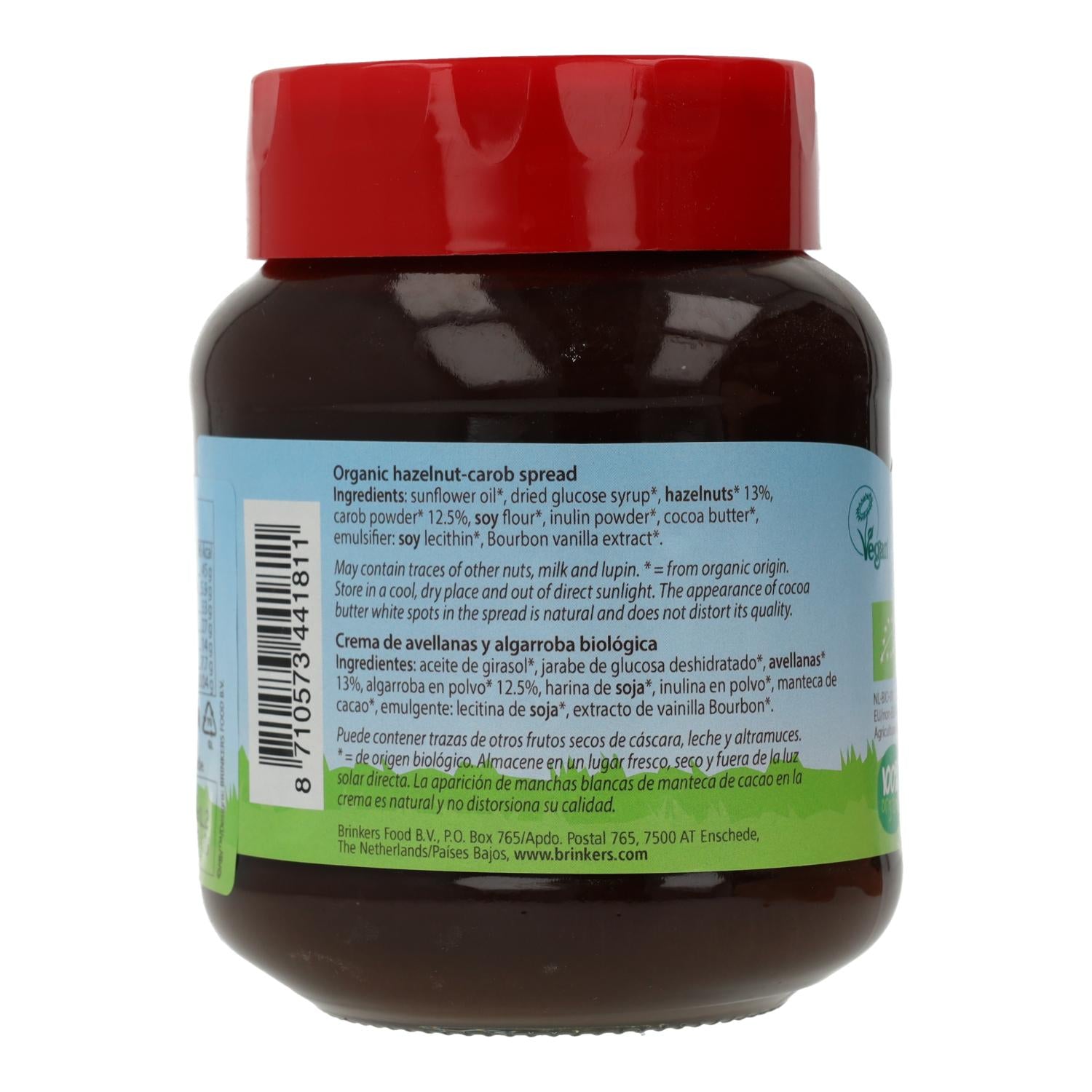 Ingredientes: Aceite de girasol*, jarabe de glucosa deshidratado*, AVELLANAS* 13%, algarroba en polvo* 12.5%, harina de SOJA*, inulina*, manteca de cacao*, emulgente: lecitina de SOJA*, extracto de vainilla Bourbon*. * De agricultura biológica. Trazas : Altramuces y prod. a base de altramuces Frutos secos con cáscara Trazas : Leche y derivados Soja y derivados