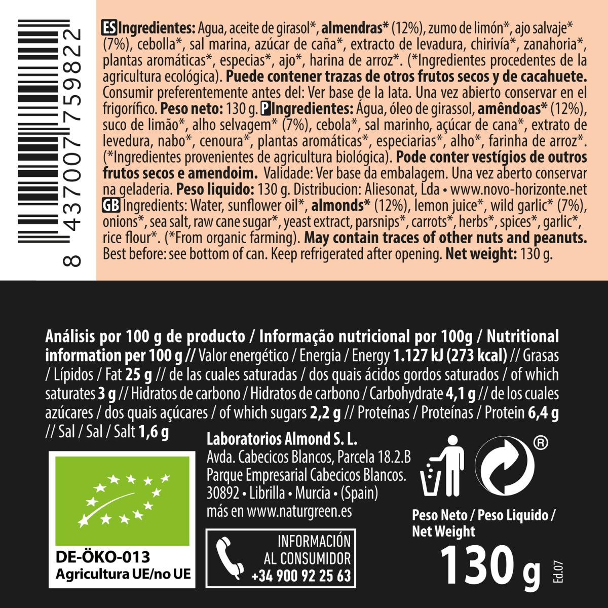 Ingredientes: Agua, aceite de girasol*, almendras*(12%), zumo de limón*, ajo salvaje*(7%), cebolla*, sal marina, azúcar de caña*, extracto de levadura, chirivía*, zanahoria*, plantas aromáticas*,