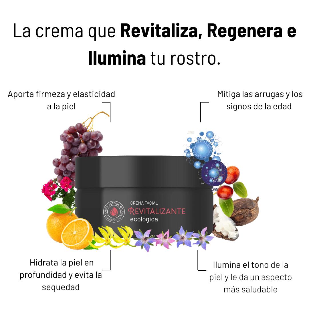 La Crema Facial Revitalizante ofrece un cuidado diario completo para las pieles maduras y apagadas, ayudando a combatir los signos de envejecimiento de forma eficaz. Contribuye a recuperar luminosidad y firmeza, mitigando arrugas, manchas y otras imperfecciones. Su exclusiva fórmula ECOLÓGICA ha sido diseñada a base Activos Botánicos Concentrados con reconocidas propiedades regenerantes, antioxidantes y reafirmantes, cuya estudiada sinergia multiplica su efectividad.