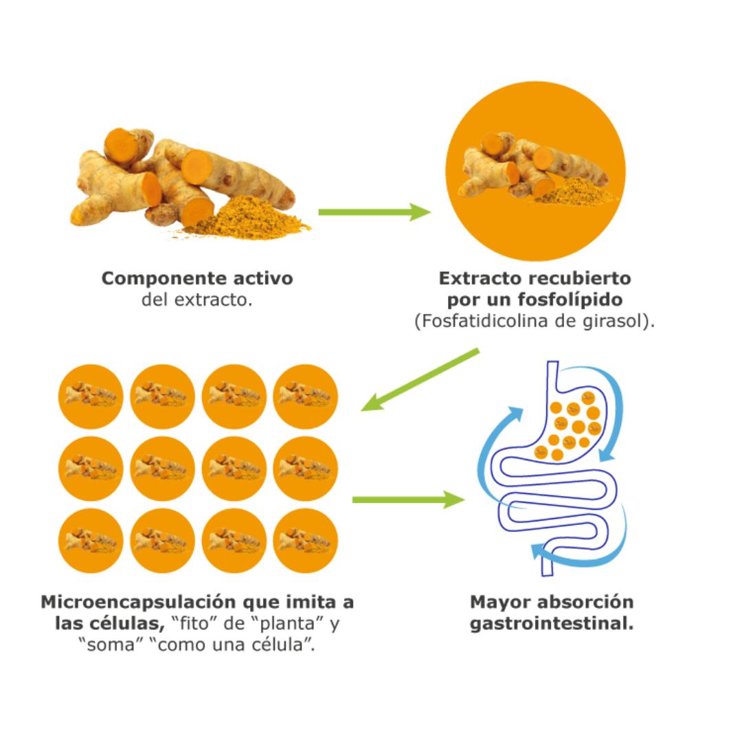CurcuFit® es un complemento alimenticio que contiene un extracto de curcumina (Meriva®), formulado con la tecnología Phytosome® que permite ingerir dosis alimenticias de cúrcuma con un efecto altamente maximizado (hasta 30 veces mayor absorción que la misma curcumina sin aplicar la tecnología Phytosome®), estandarizado al 18-22% de curcuminoides.