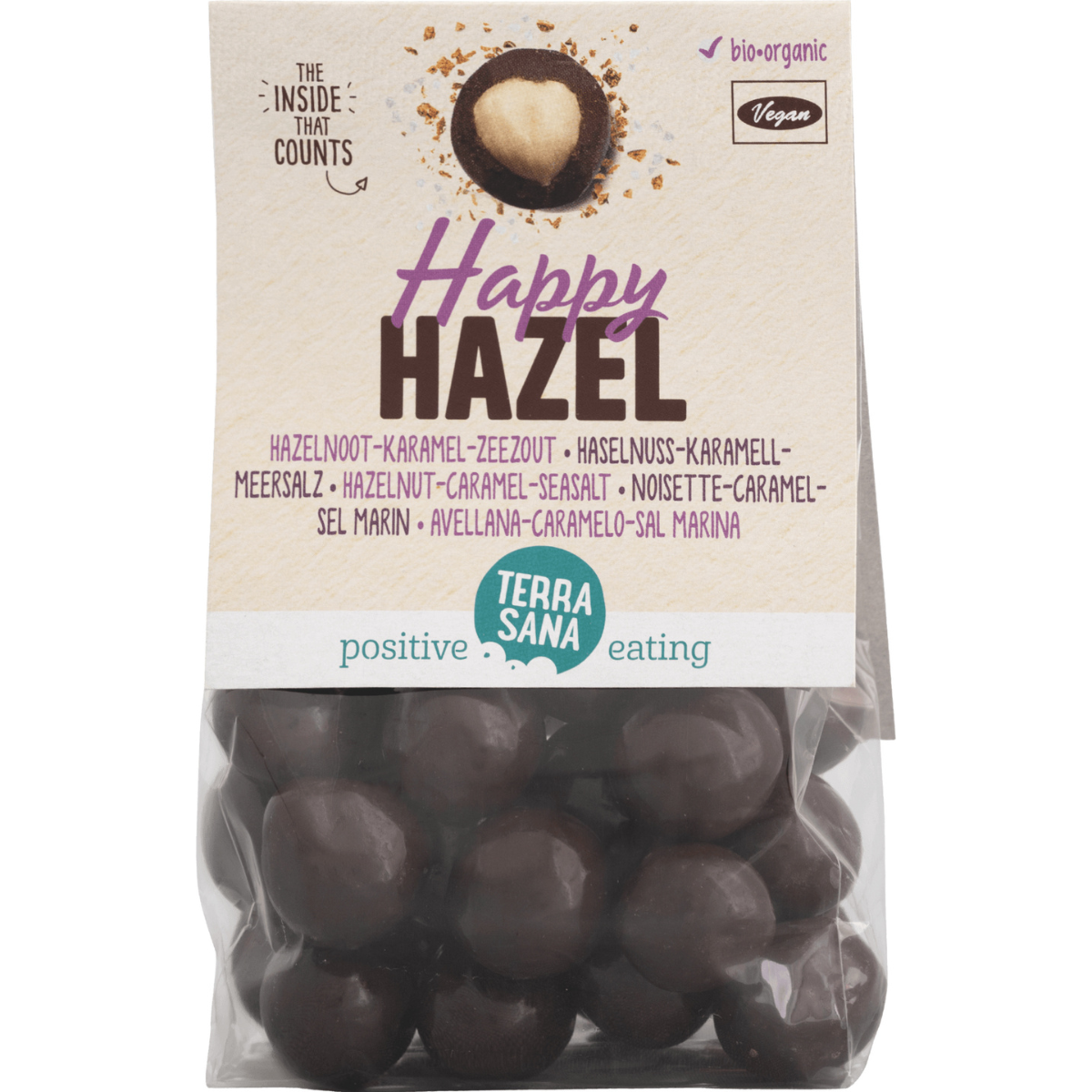 Chocolate* 74,2% (azúcar de caña*, pasta de cacao*, manteca de cacao*, extracto de vainilla Bourbon*), 24,8% AVELLANA* (Turquía), 0,5% aroma natural: caramelo* (Alemania), 0,25% sal marina (Francia), aceite de girasol*, agente de recubrimiento: goma arábiga* (Alemania) * = procedente de la agricultura ecológica