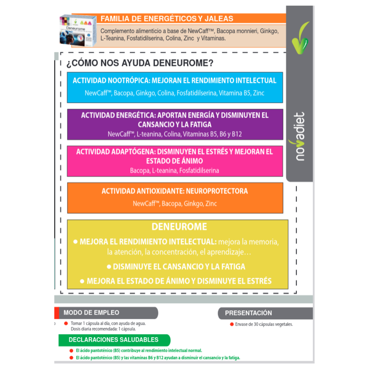 Deneurome de Nova Diet es un complemento alimenticio nootrópico formulado para apoyar el rendimiento cognitivo y mental. Contiene una combinación de ingredientes como Bacopa monnieri, Ginkgo biloba, L-teanina, colina, fosfatidilserina, zinc y vitaminas del grupo B, junto con NewCaff™ (cafeína microencapsulada). Esta fórmula está diseñada para mejorar la memoria, la atención, la concentración y reducir el cansancio mental. Es especialmente útil en períodos de alta exigencia intelectual o estrés