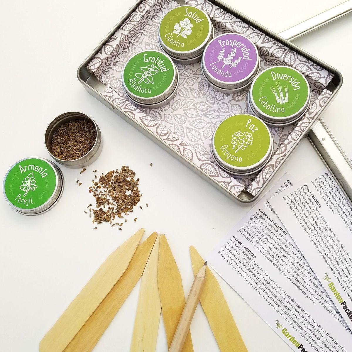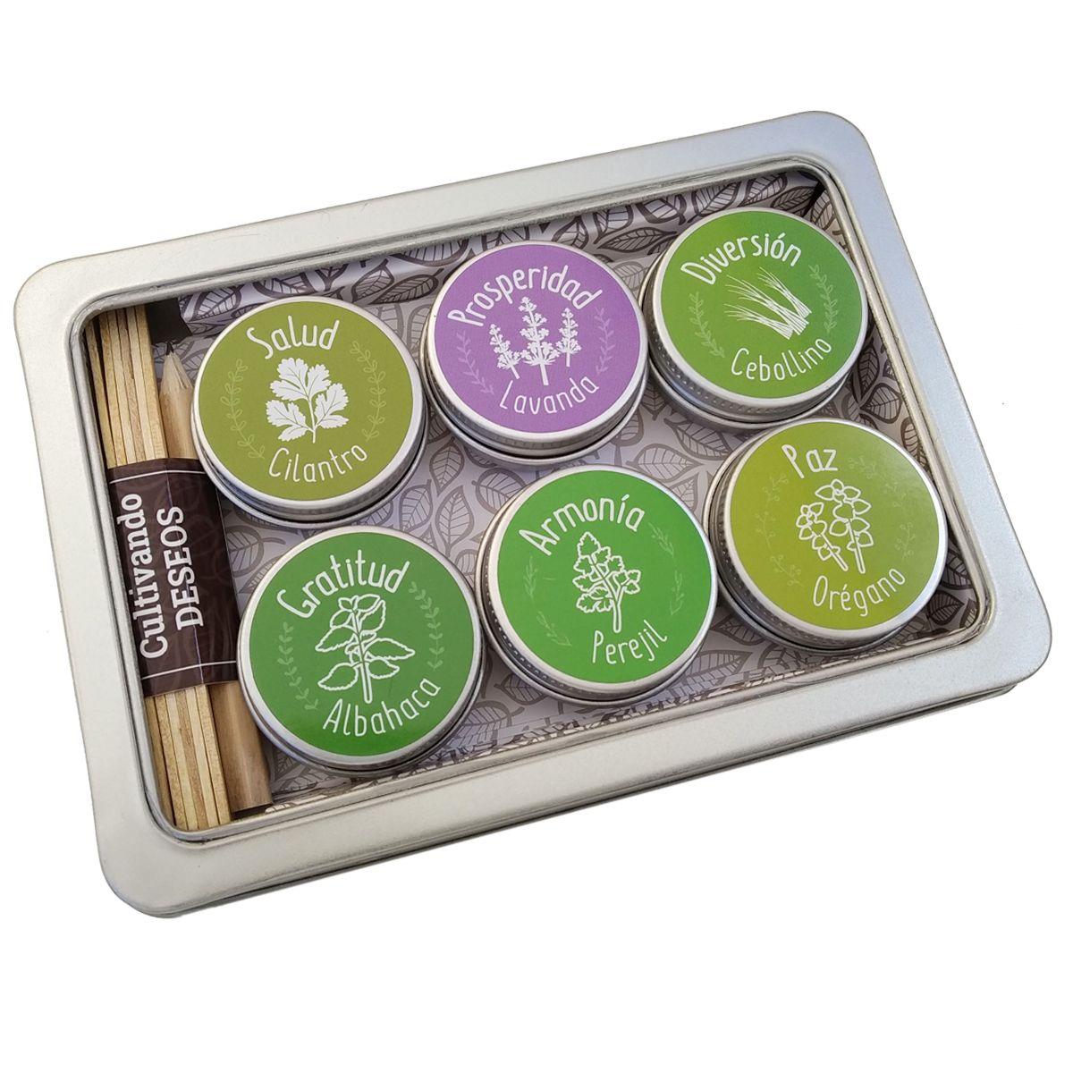 - 6 variedades de semillas: cebollino, albahaca, cilantro, perejil, orégano y lavanda