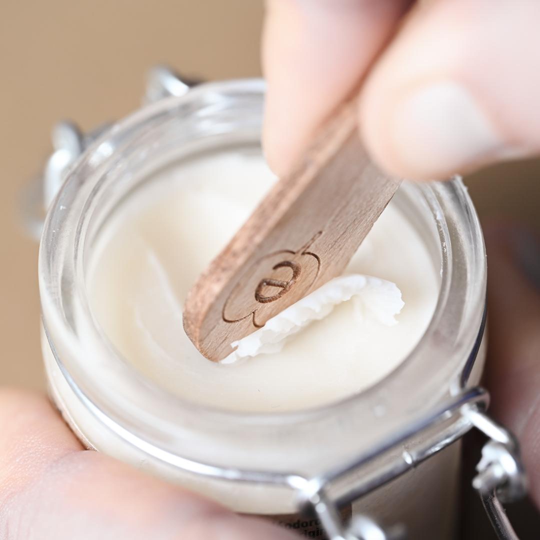 - Coger una cantidad muy pequeña de bálsamo con el dedo o con la espátula de madera (es importante no utilizar demasiado producto)