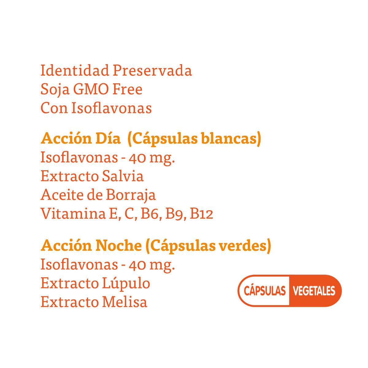 - Cápsulas Verdes: extracto de soja rico en Isoflavonas (100 mg, eq, a 40 mg de Isoflavonas), extracto de lúpulo: Humulus lupulus (100 mg), extract de melisa (melisa officinalis) agente de carga (maltodextrinas de maiz) y Antiaglomerantes (dioxido de silicio y estearato de magnesio), Piridoxna clorhidrato (2 mg, eq. a 2 ug deVitaina B9) y Cianocobalimina (1 ug, eq. a 1ug de Vitamina B12). Composición de la cubierta de la cápsula: hidroxiproplmetilcelulosa, colorante (dióxido de titanio). Peso neto de la cápsula: 0.36 g.