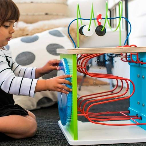 Este cubo de actividades de madera permitirá al niño experimentar múltiples actividades realizando diferentes experimentos en movimiento. Tiene diferentes actividades para estimular los sentidos de los pequeños. Caracteristicas: - Laberinto en la parte superior con cuentas magnéticas flotantes y engranajes. - Pelota laberinto con efecto espejo - Laberinto de diapositiva de animación