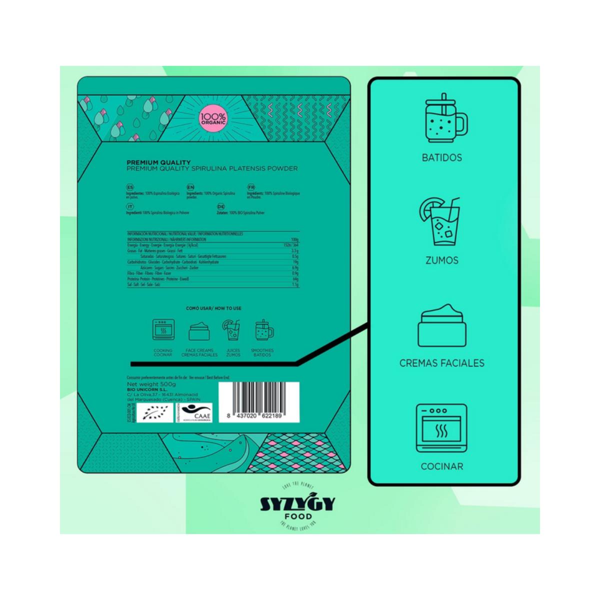 Toda la información sobre "Espirulina en Polvo Ecológica Certificada, 500g. Syzygy Foods"