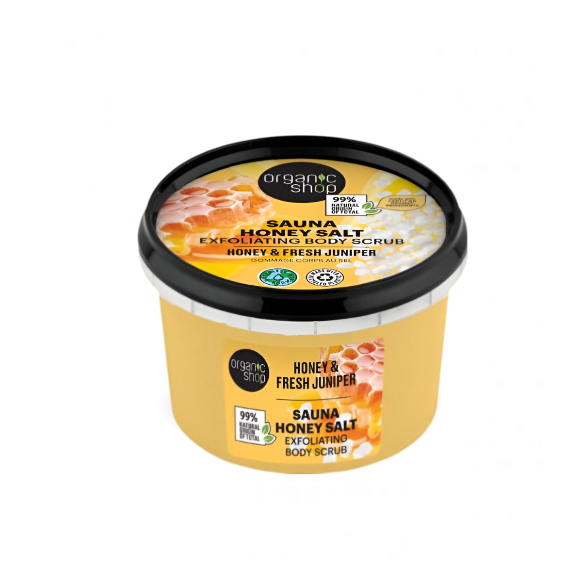 Toda la información sobre "Exfoliante corporal de sal «Miel y enebro» con efecto sauna, Organic Shop 250 ml"