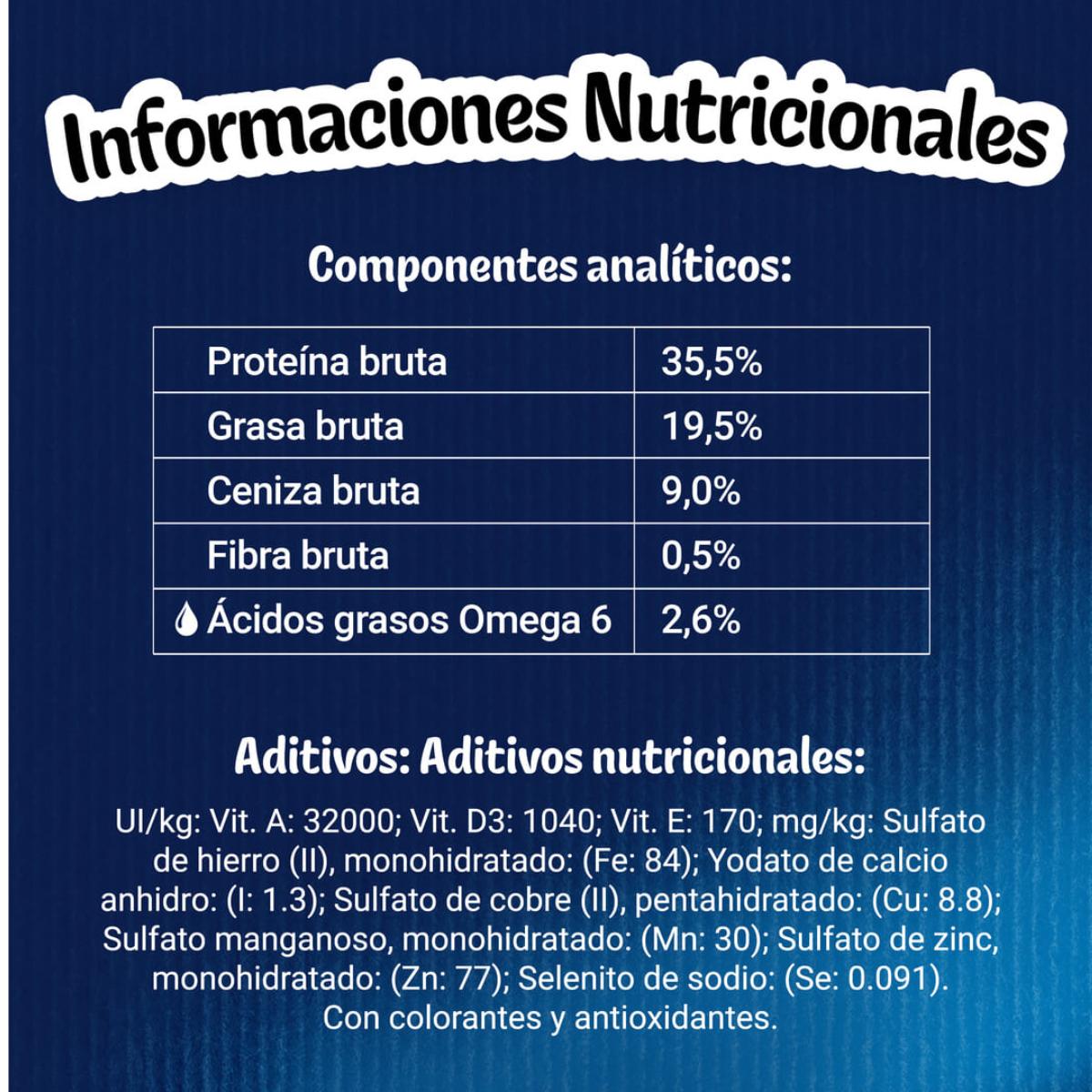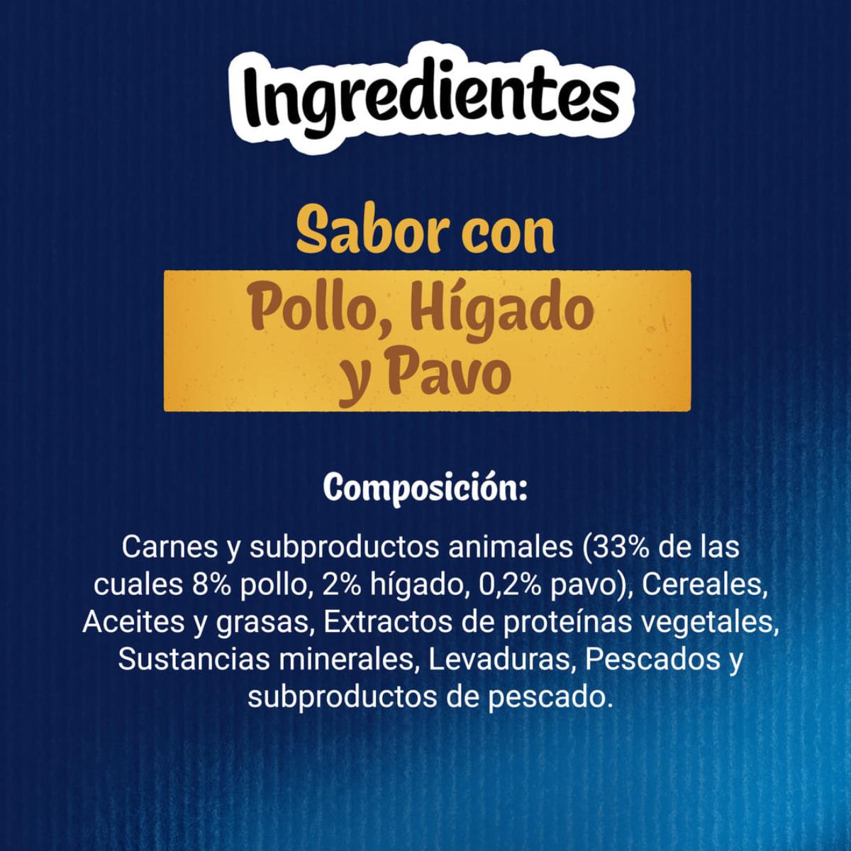 Carnes y subproductos animales (33% de las cuales 8% pollo, 2% hígado, 0,2% pavo)