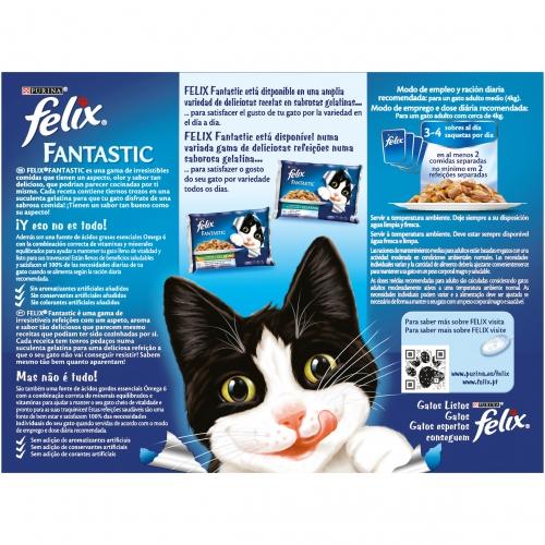 FELIX Fantastic es una gama de deliciosas comidas que tienen un aspecto y olor tan jugoso, que podrían parecer comida cocinada por ti mismo. Especialmente preparados con tiernos y carnosos trocitos en una suculenta gelatina, tu gato los encontrará irresistibles en cada comida. Además, FELIX Fantastic está disponible en una gama de sabores con carnes y pescados para satisfacer el gusto de tu gato por la variedad.