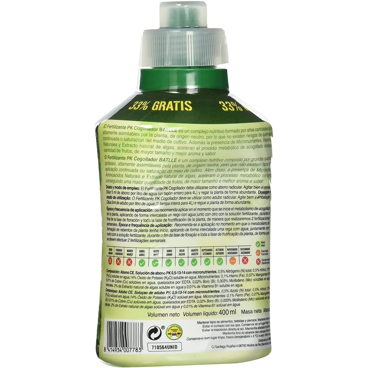 El Fertilizante PK Cogollador BATLLE es un complejo nutritivo formado por altas cantidades de fósforo y potasio, altamente asimilables por la planta, de origen neutro, por lo que no existen riesgos de quemadura por aplicación continuada o saturación del medio de cultivo. Además la presencia de Micronutrientes, Vitamina B1, Aminoácidos Naturales y Extracto natural de algas, aceleran el proceso metabólico de acogollado consiguiendo una mayor cantidad de frutos, de mayor tamaño y mejor aroma y sabor.
