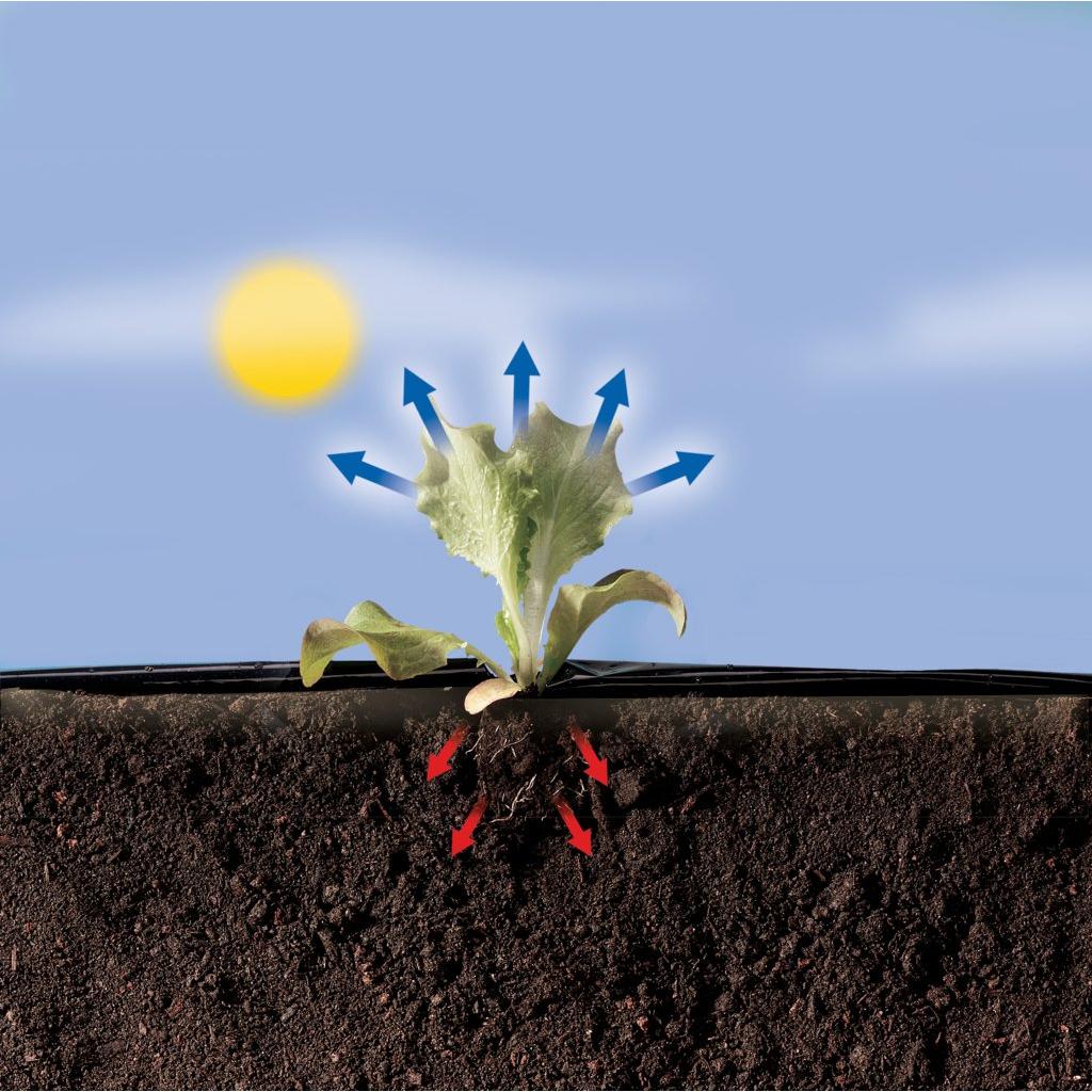 - Favorece el crecimiento del cultivo gracias al efecto de regulación térmica: se recalienta durante el día y limita el enfriamiento del suelo durante la noche.