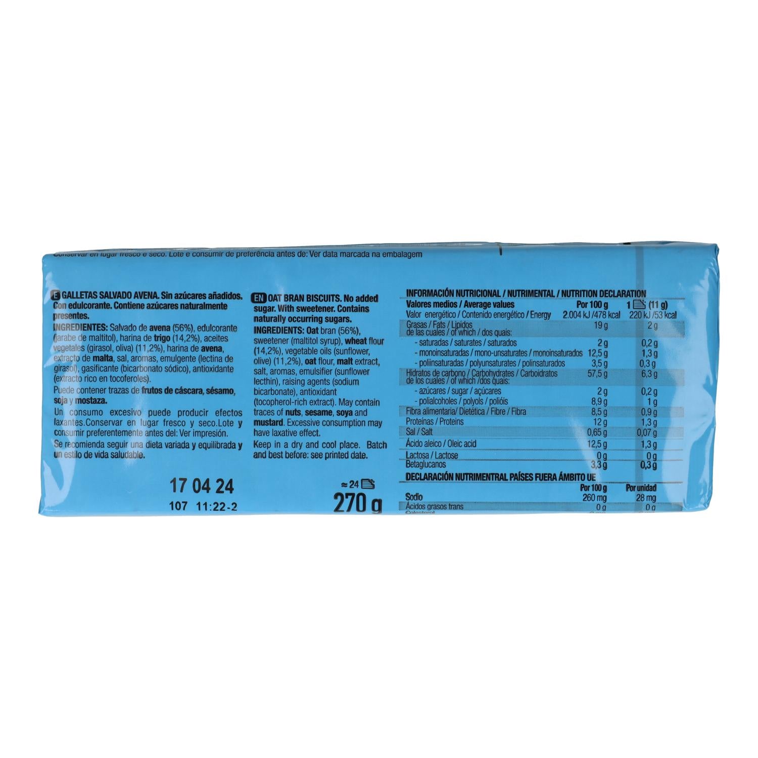Salvado de avena (56%), edulcorante (jarabe de maltitol), harina de trigo (14,2%), aceites vegetales (girasol, oliva) (11,2%), harina de avena, extracto de malta, sal, aromas, emulgente (lecitina de girasol), gasificante (bicarbonato sódico), antioxidante (extracto rico en tocoferoles).