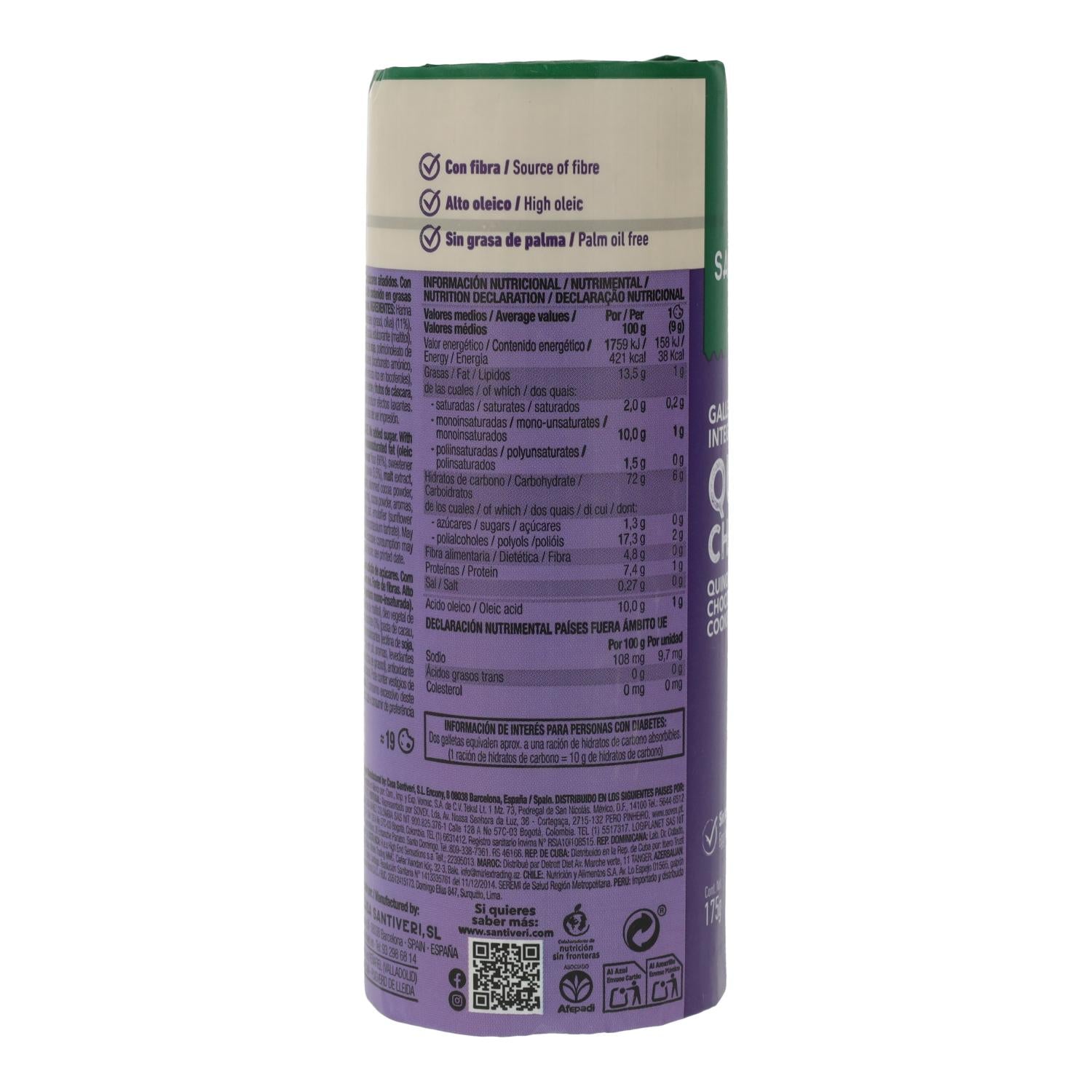 Toda la información sobre "Galletas Integrales Quinoa/Choco 0% azúcares Santiveri 175 g"