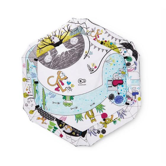 6 paredes de colores con diferentes historias que se pueden levantar y conectar, lo que anima al niño a levantar la cabeza. La manta plegada también tiene la función de parque.