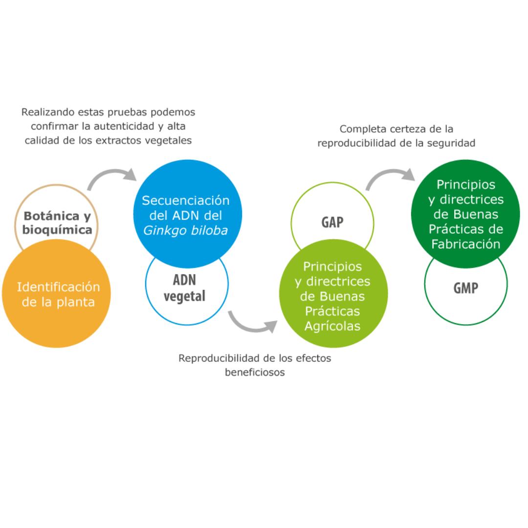 Ginkgo 100® es un producto de alta calidad en la que se siguen las normas GAP (Buenas Prácticas Agrícolas) y GMP (Buenas Prácticas de Fabricación) (ICH Q7A), así como la secuenciación del ADN de la planta.