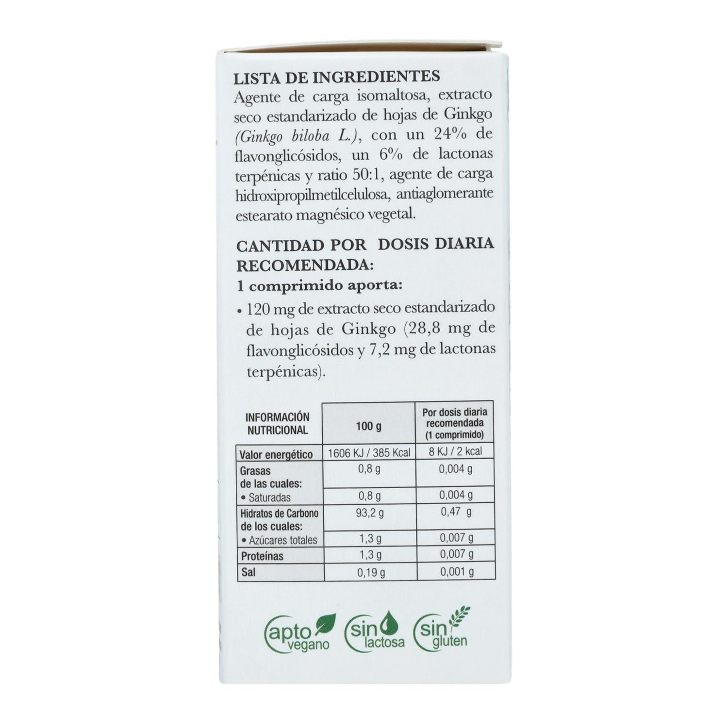 Cantidad por dosis diaria recomendada: 1 comprimido aporta: 120 mg de extracto seco estandarizado de hojas de Ginkgo (28,8 mg de flavonglicósidos y 7,2 mg de lactonas terpénicas).