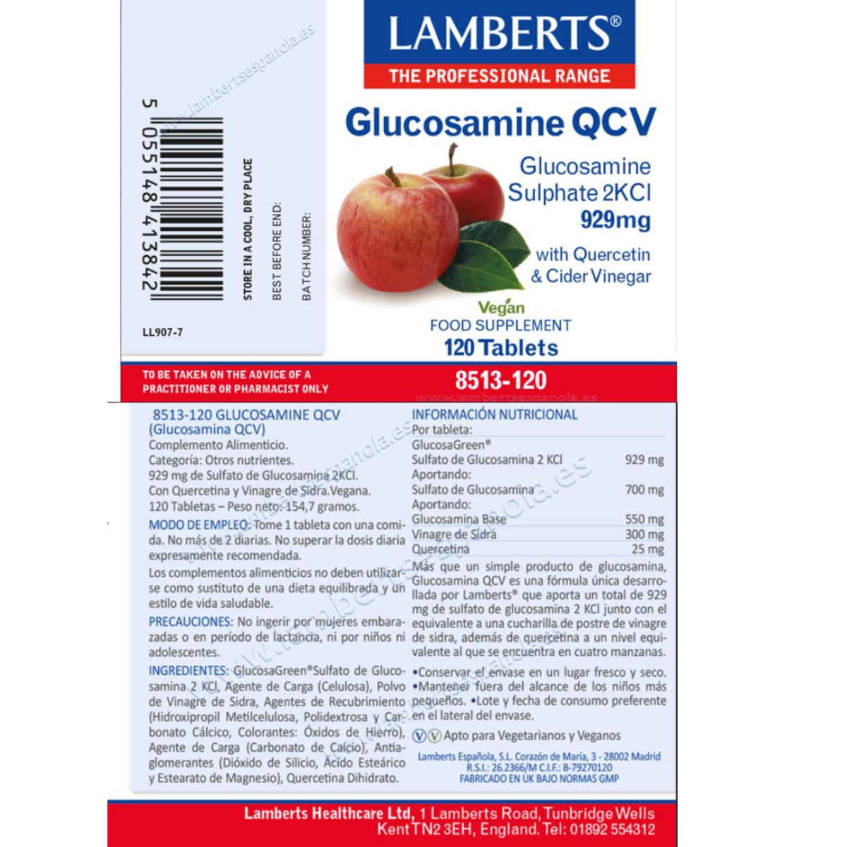 Glucosamina QCV 929 mg de sulfato de glucosamina 2KCI Lamberts 120 tabletas