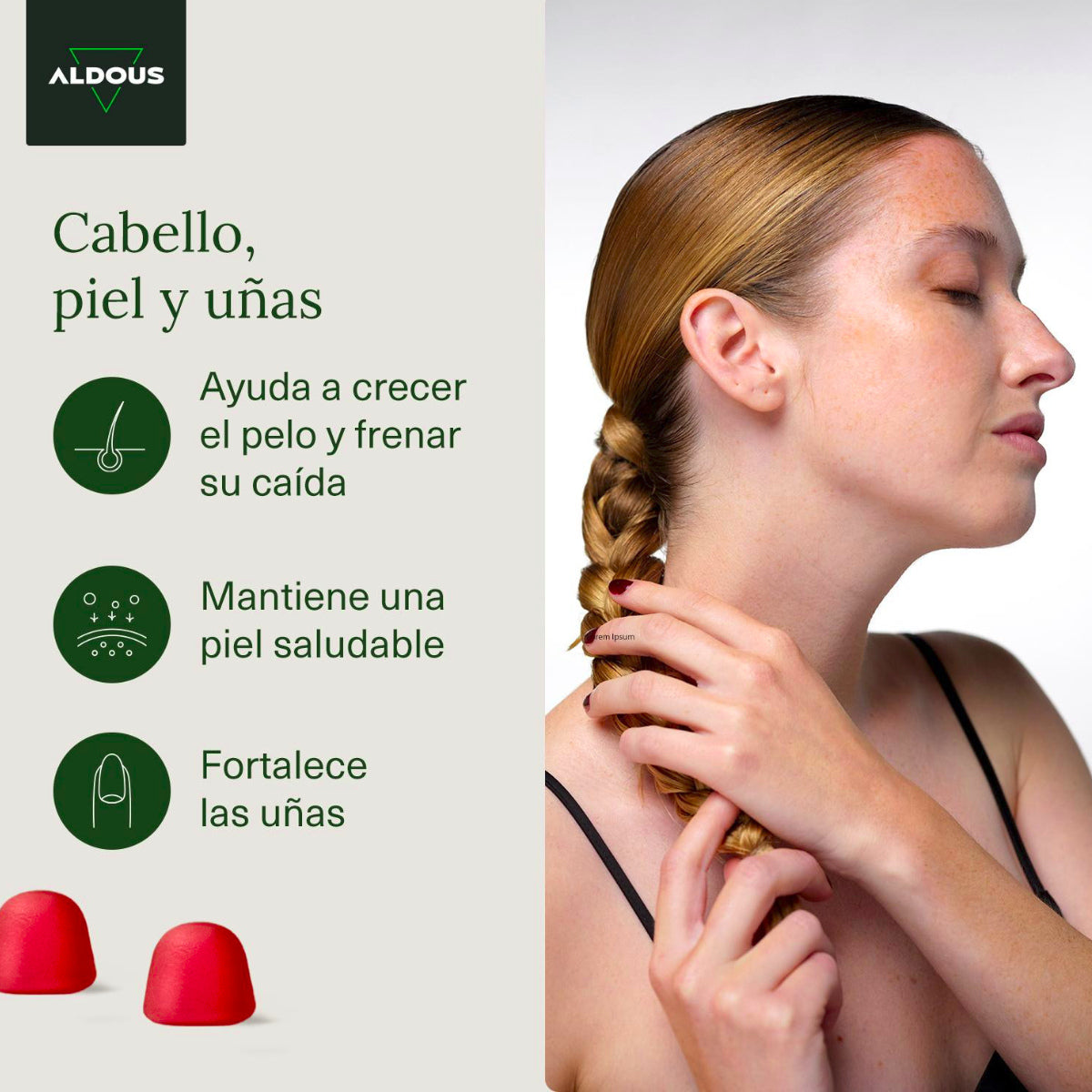 Nutre tu cabello desde el interior con la Biotina en gominolas Aldous. Una formulación avanzada con Vitamina A, Vitamina B5, Vitamina B6, Vitamina B12, Vitamina C, Vitamina D, Vitamina E, Ácido Fólico, Yodo, Selenio y Zinc presentada en 120 gummies para 120 días.