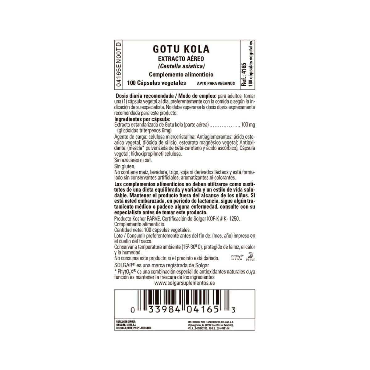 Gotu Kola (100 mg), Ácido ascórbico, Mezcla en polvo de betacarotenos.